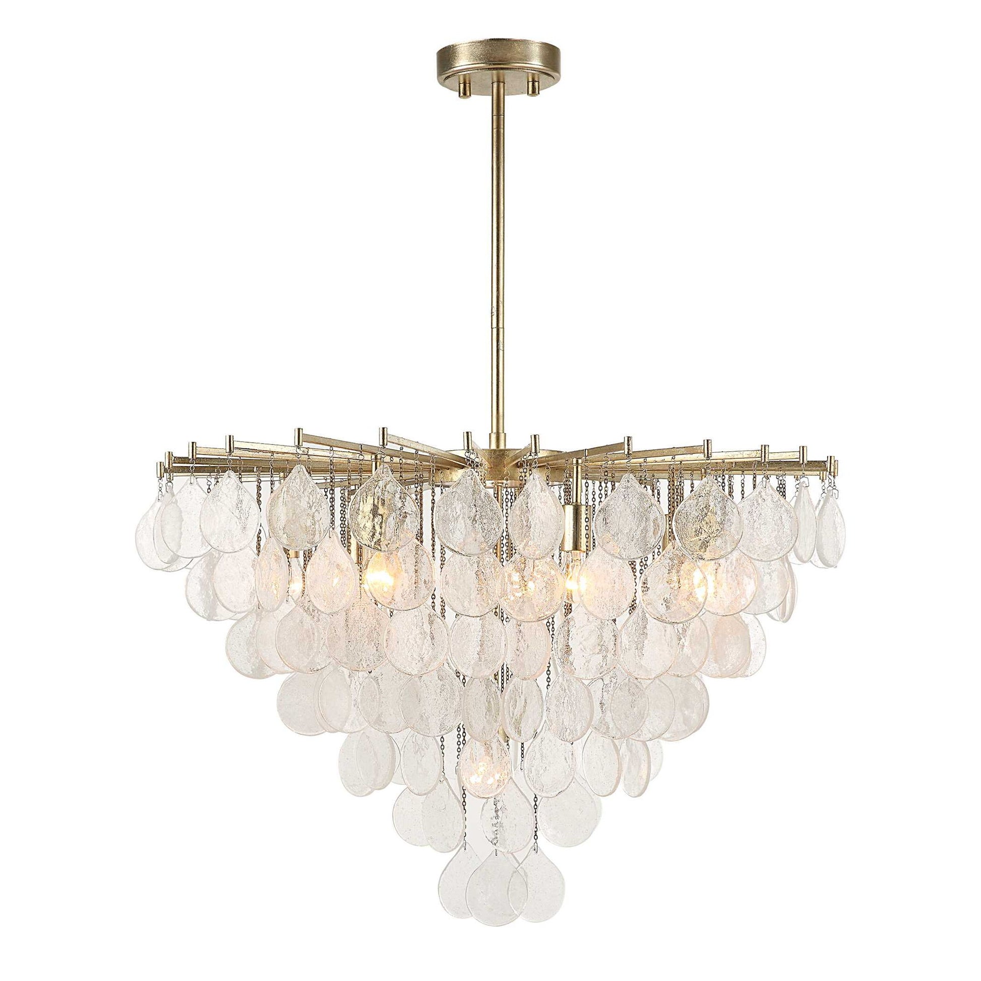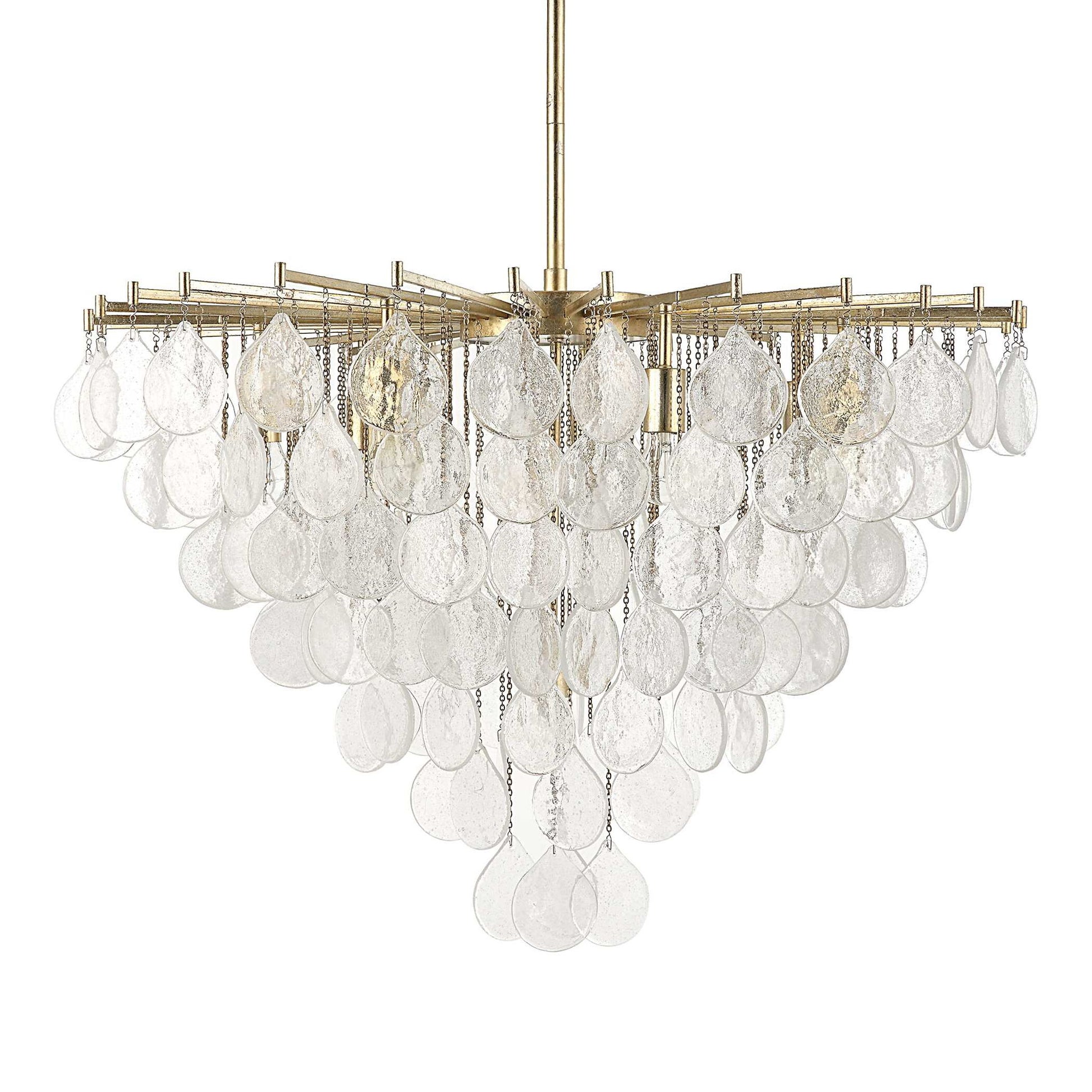 A Classic Shape With Sumptuous Tear Drop Seeded Glass Suspended On Fine Chains Refracting Light Beautifully. Transcending Traditional Design To Blend In With Even More Contemporary Interiors And Finished In A Rich Antique Bright Silver Leaf. 8-60 Watt Max, Edison Sockets. Bulbs Not Included. Supplied With 15' Wire, 3-12" Stems And 1-6" Stem For Adjustable Installation.