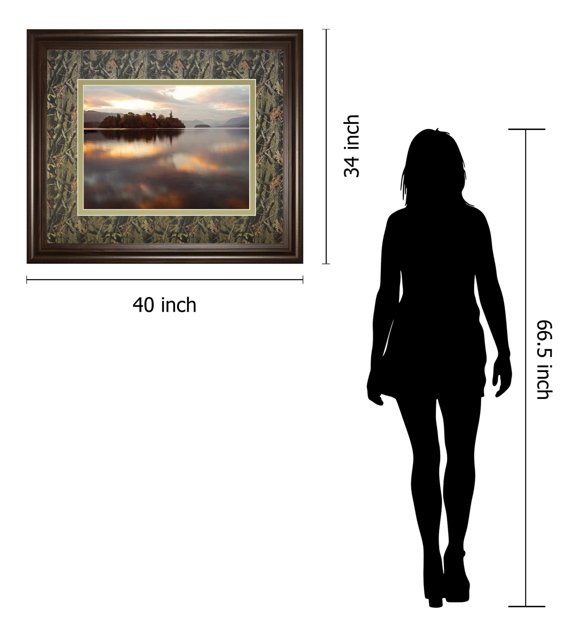 Step into a moment of peaceful reflection with this captivating lakeside scene at sunset. The gentle ripples mirror the soft autumn hues of the trees, creating a harmonious blend of earth tones and sky. Framed in a rich brown wood with a double mat in green and cream, this piece brings warmth and elegance to any living room, bedroom, or office. The premium real glass protects the vibrant photographic print, inviting you to pause and immerse yourself in the serene beauty of nature's quiet embrace.