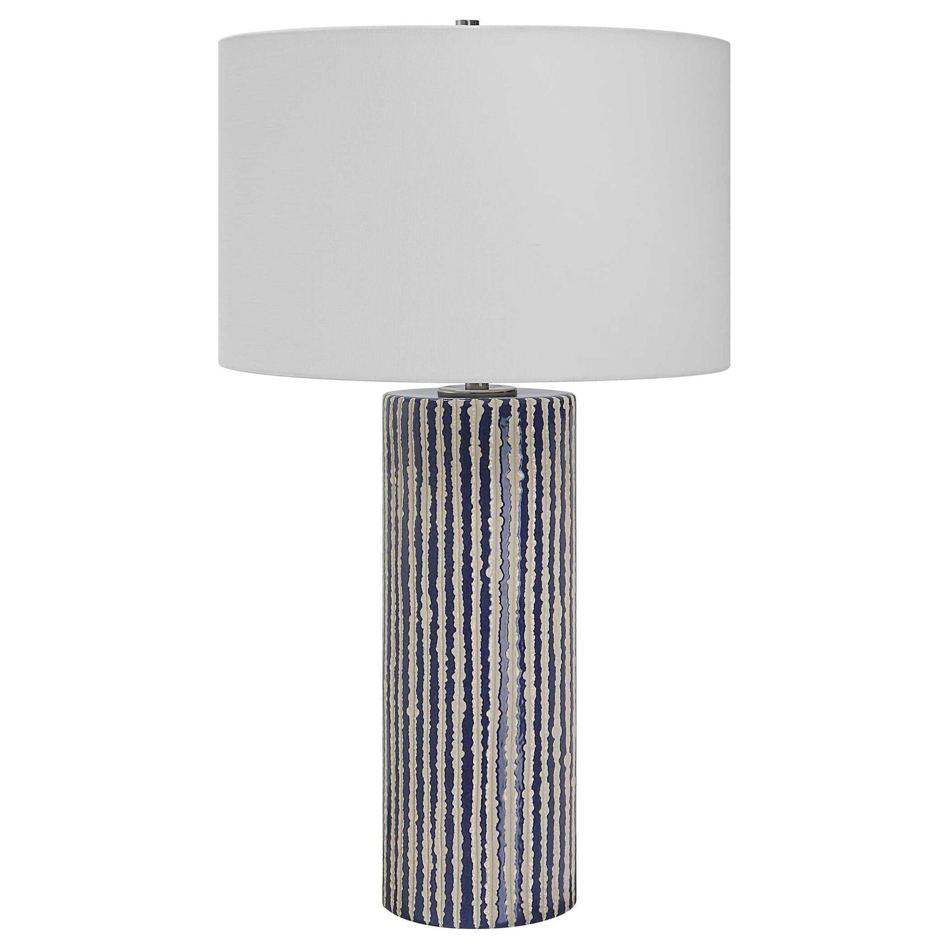 This Ceramic Table Lamp Features Eye-catching, Crudely Carved, Cobalt Glazed Stripes With Contrasting Ivory, Accented With Brushed Nickel Details. The Round Hardback Shade Is Covered In A White Fabric.