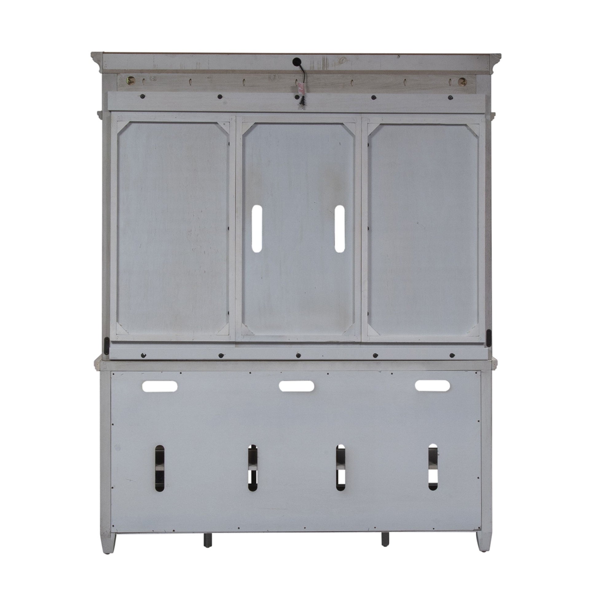 Accent your living room with the perfect vintage design, using this unique and stylish entertainment center. Crafted with rubberwood solids, bottom case dust proofing, wood framed glass doors, additional shelving in the hutch, LED touch lighting to illuminate the piece, is anchored by heavy tapered feet and accented by timeless antiqued brass knob hardware, and can accommodate most 65" TVs. With today's modern technology in mind, users can enjoy the convenience of the open compartment areas and wire management provisions to hide those pesky wires from your DVD player or gaming console of choice.