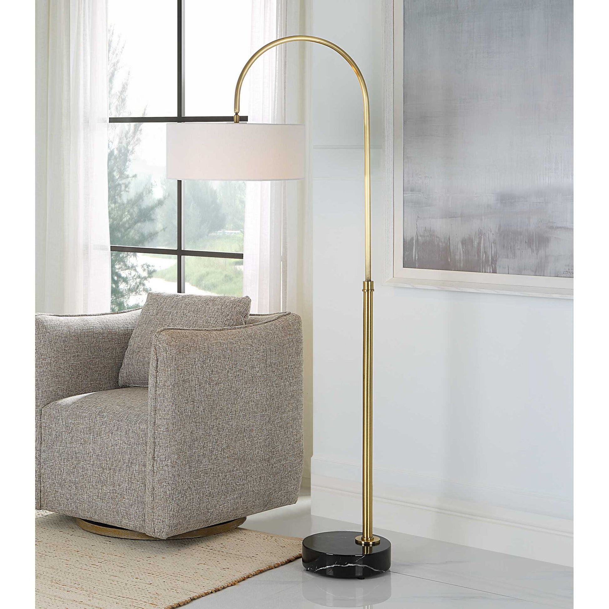 This Classic Arc Floor Lamp Is Crafted From Iron Finished In A Plated Antique Brushed Brass, Accented By A Thick Black Marble Foot With Natural Veining. The Suspended Round Hardback Shade Is Covered In An White Linen Fabric, Attached To A Pivoting Neck Allowing The Shade To Be Placed At An Angle If Desired.