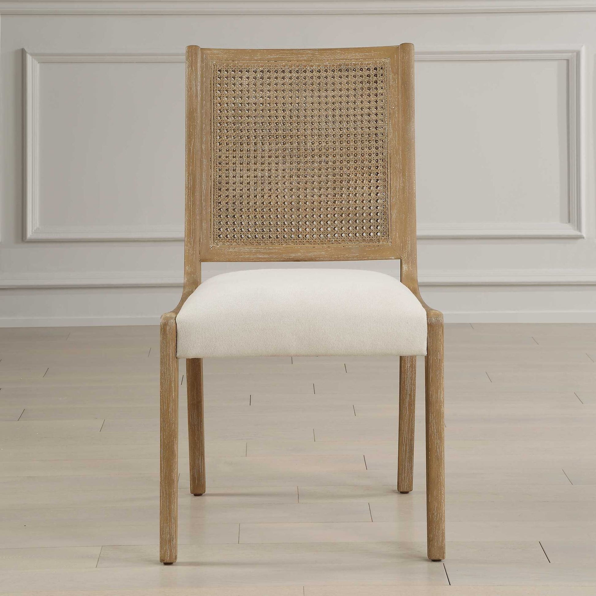 Casual Coastal Inspired Styling With Elevated Details In The Swooped Seat Frame In Solid Wood, Finished In Light Oak Ceruse. The Supportive Rattan Caned Back Is Paired With A Plush Seat Upholstered In A Frost Toned Polyester Fabric With A Toxin-free, Eco Friendly Treatment To Help Resist Water Based Stains. Sold As A Set Of 2. Seat Height Is 19".