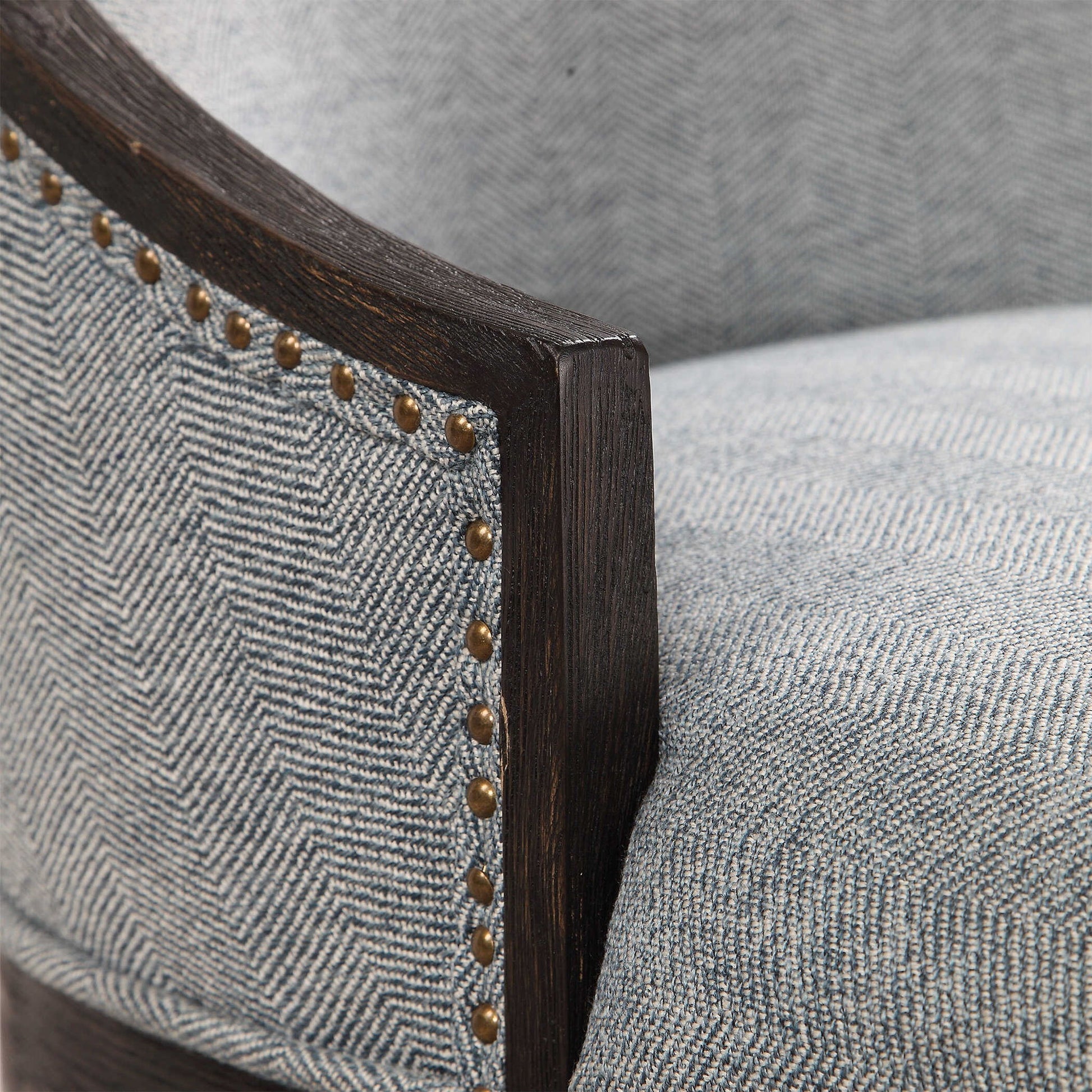 Curved Back Design In A Woven Light Denim, Accented By Antique Brass Nail Head Trim. Wire Brushed Birch Frame Is Finished In An Ebony Stain.