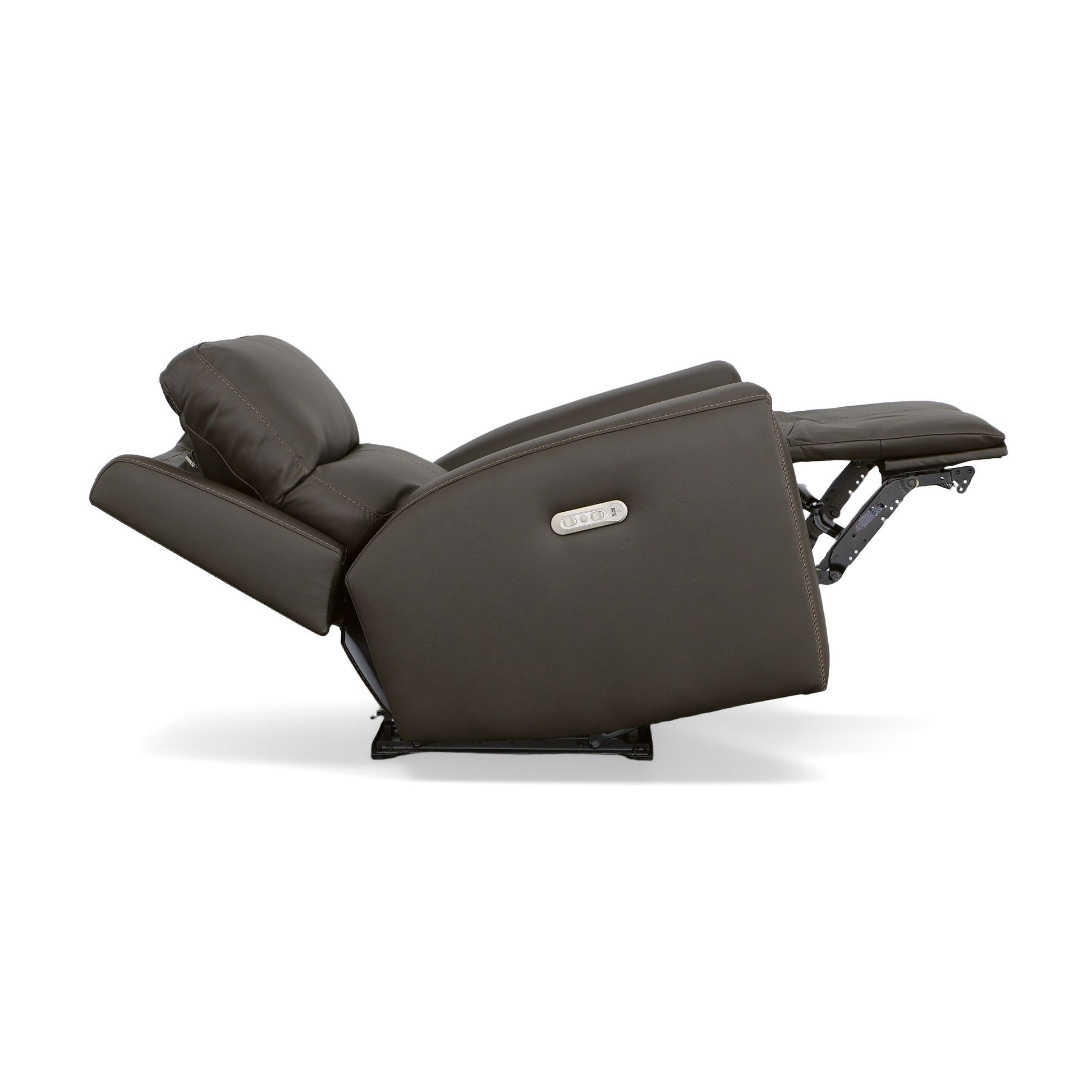 Whether you’re a gamer, streamer, or enthusiastic napper, there’s no better place to enjoy some down time than in Jarvis leather power recliner with power headrest. No matter how you’re relaxing, this recliner will keep you comfy with Zero Gravity recline technology, which takes pressure off your body and give you a feeling of weightlessness. Flexsteel's patented Blue Steel Spring™ system ensures an optimal range of motion and quality that will last. A power control with built-in USB charging port independently adjusts the headrest and recline, so you can find the best angles for ultimate relaxation. High on style, this contemporary recliner is upholstered in a dark mica brown leather and features clean lines, sleek pad-over arms and decorative cross-stitching.