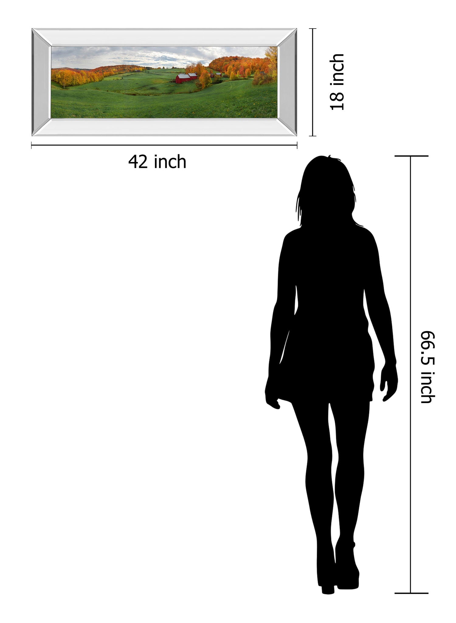 Step into the tranquil charm of countryside living with this panoramic view of an autumn farmstead. Rolling green fields stretch beneath a sky filled with soft clouds, while vibrant fall foliage in shades of orange, red, and yellow surrounds classic red barns, creating a scene full of warmth and nostalgia. The mirrored frame adds a contemporary elegance, reflecting light and enhancing the depth of the landscape, while premium real glass preserves the vivid colors and fine details. Perfect for adding a peaceful, inviting touch to living rooms, offices, or dens, this piece is ready to hang and crafted with care to bring a sophisticated yet natural ambiance to your space.