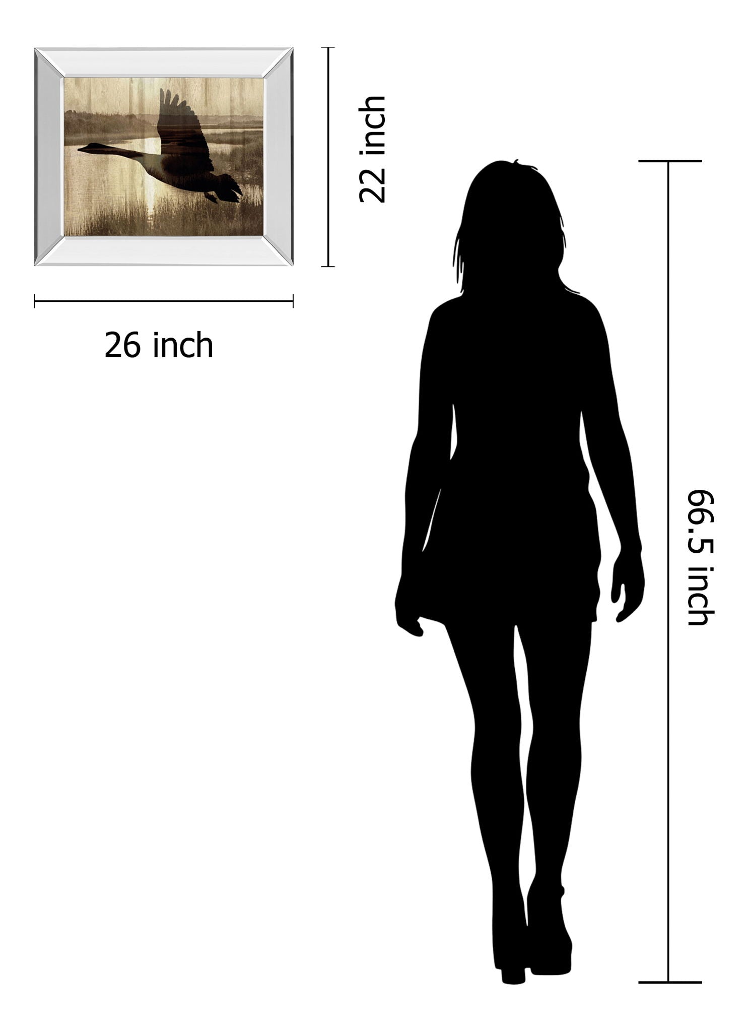Immerse yourself in the tranquil beauty of a serene marshland captured in this exquisite framed photo print. Featuring a graceful goose in mid-flight, its silhouette set against soft sepia tones evokes a peaceful moment suspended in time. The mirrored frame adds a contemporary elegance, reflecting light and enhancing the depth of the scene, making it a captivating centerpiece for any living room or office. Crafted with premium real glass for clarity and protected with expert care, this artwork invites calm and contemplation while seamlessly blending nature's timeless allure with modern design.