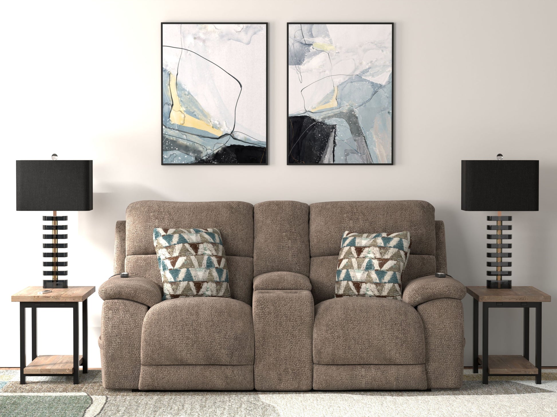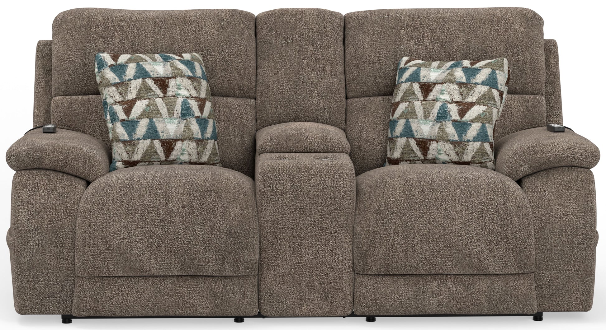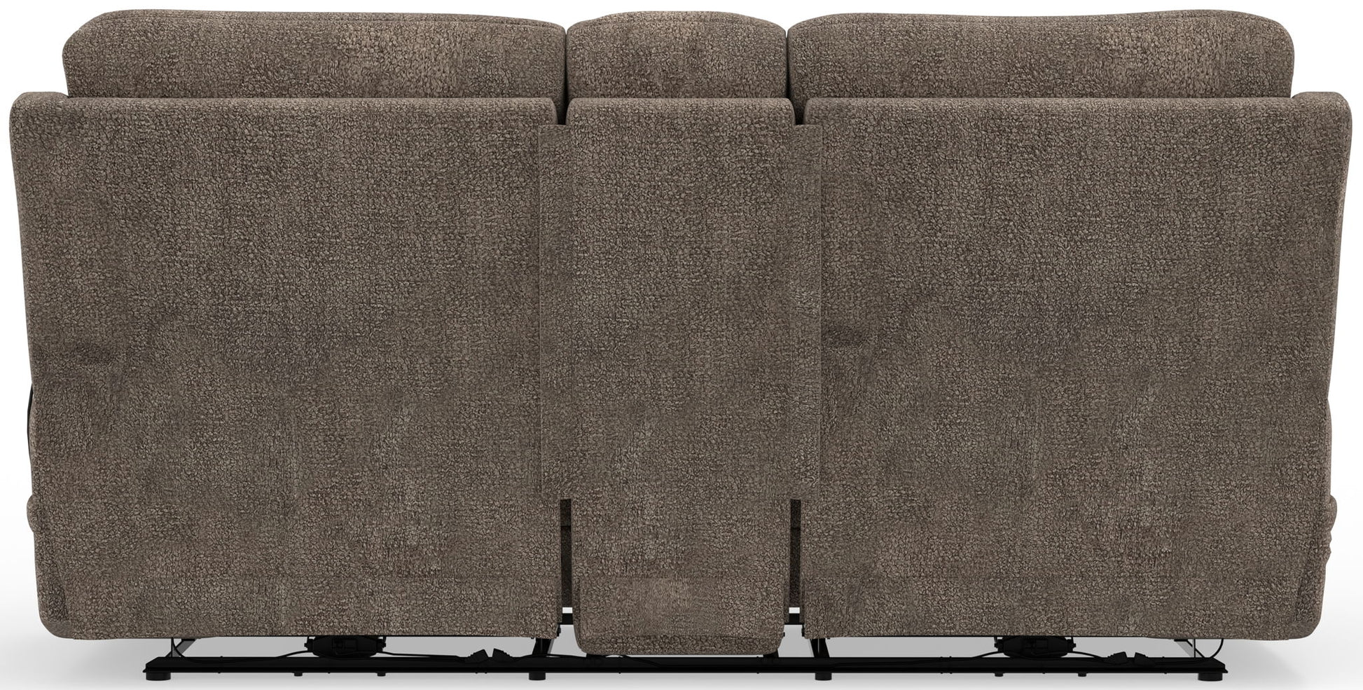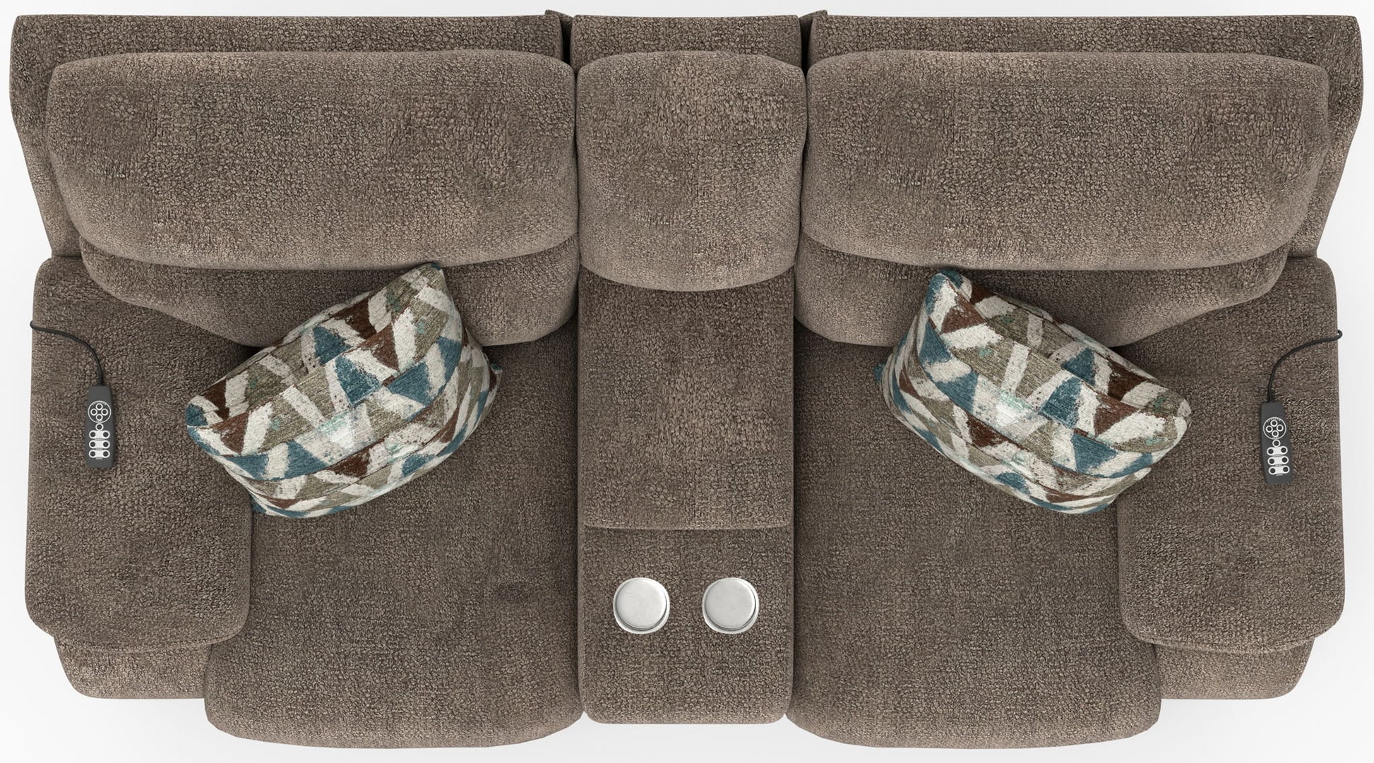Joya - Power Headrest Power Lay Flat Reclining Console Loveseat With CR3 Heat/Massage/Lumbar/ZG - Mushroom Product Pub-Back Pillow Arm Design Soft Chunky Polyester Fabric Zero-Gravity Power Recline Shiatsu Massage Feature Power Headrest/Power Lumbar Comfort Coil Seating featuring Comfor-Gel Steel Seat Box