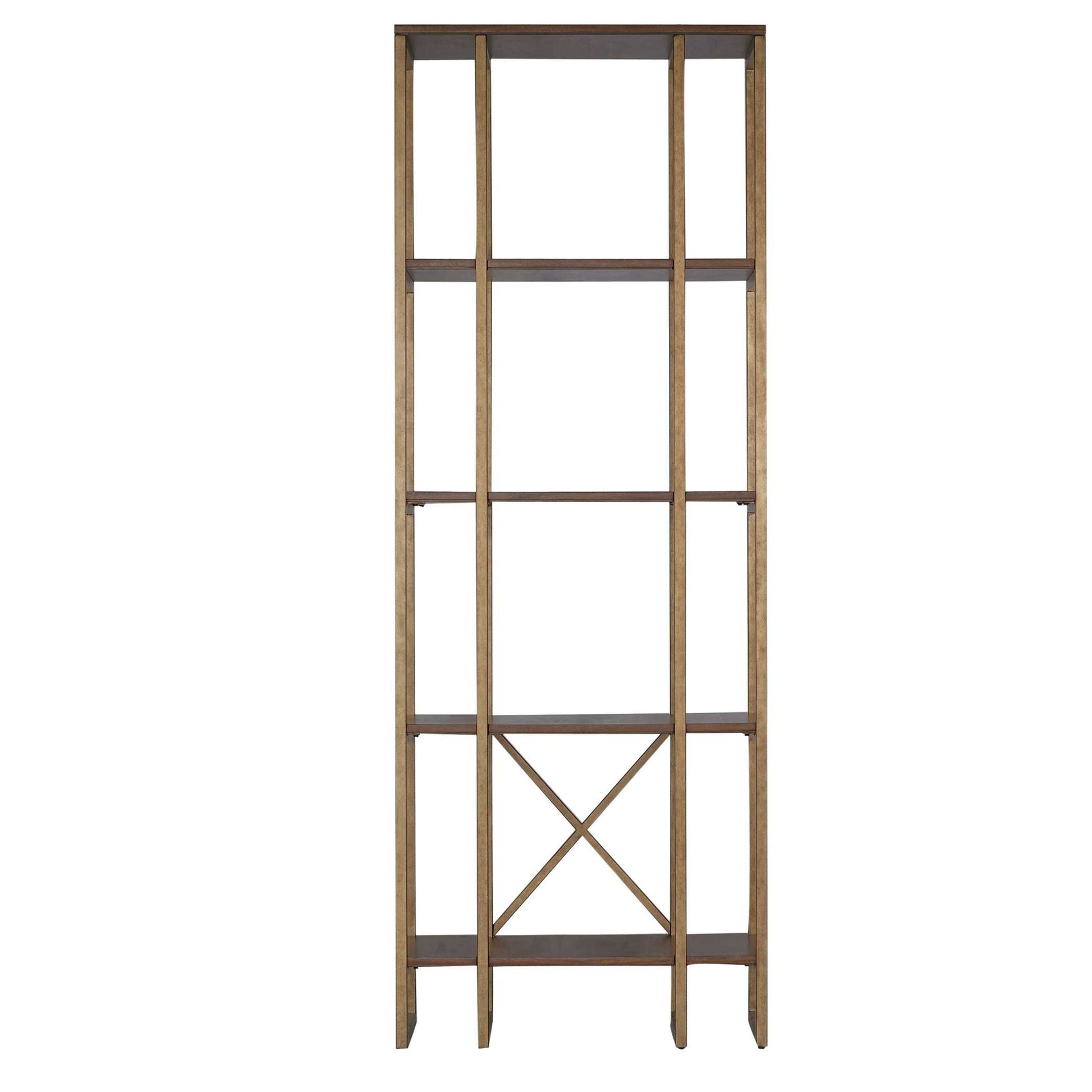 Easily Display Items On This Transitional Etagere, Finished In A Brushed Antique Gold And Accented By Four Acacia Veneer Fixed Shelves In A Rich Dark Walnut Stain.