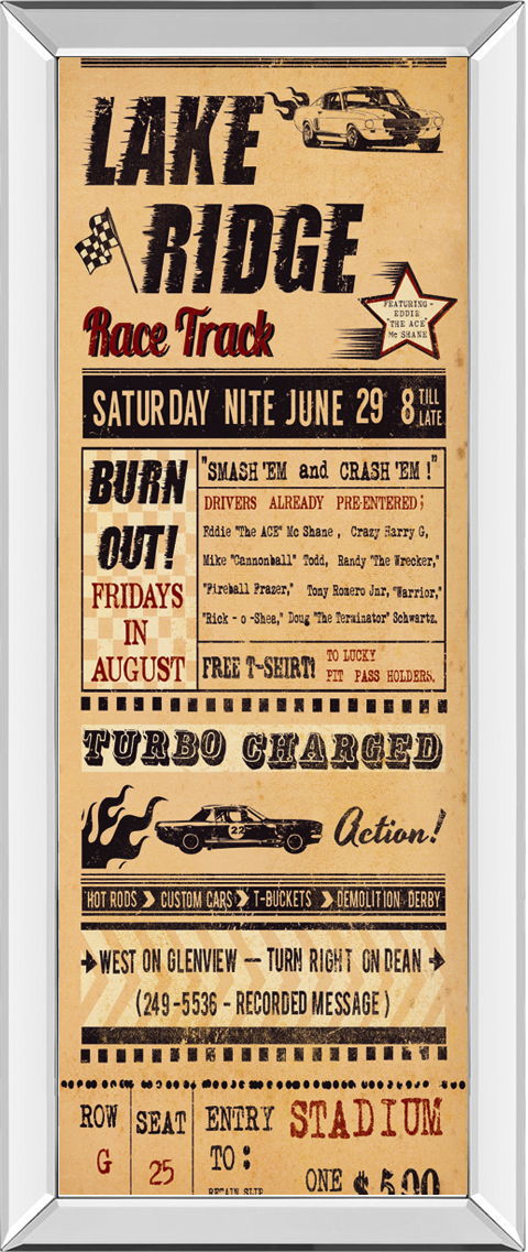 Step back into the golden era of racing with this captivating Lake Ridge Race Track poster. Its vintage-inspired design captures the raw excitement of classic car races and demolition derbies, bringing an authentic retro vibe to your space. Encased in a sleek silver mirrored frame, this piece not only enhances the vibrant beige, black, and red tones but also adds a sophisticated touch to any living room, office, or game room. Crafted with premium real glass, it delivers crisp details and vivid colors that celebrate the thrill of turbocharged action. Ready to hang and proudly made in the USA, this framed art is a perfect tribute for automotive enthusiasts and lovers of nostalgic décor alike.