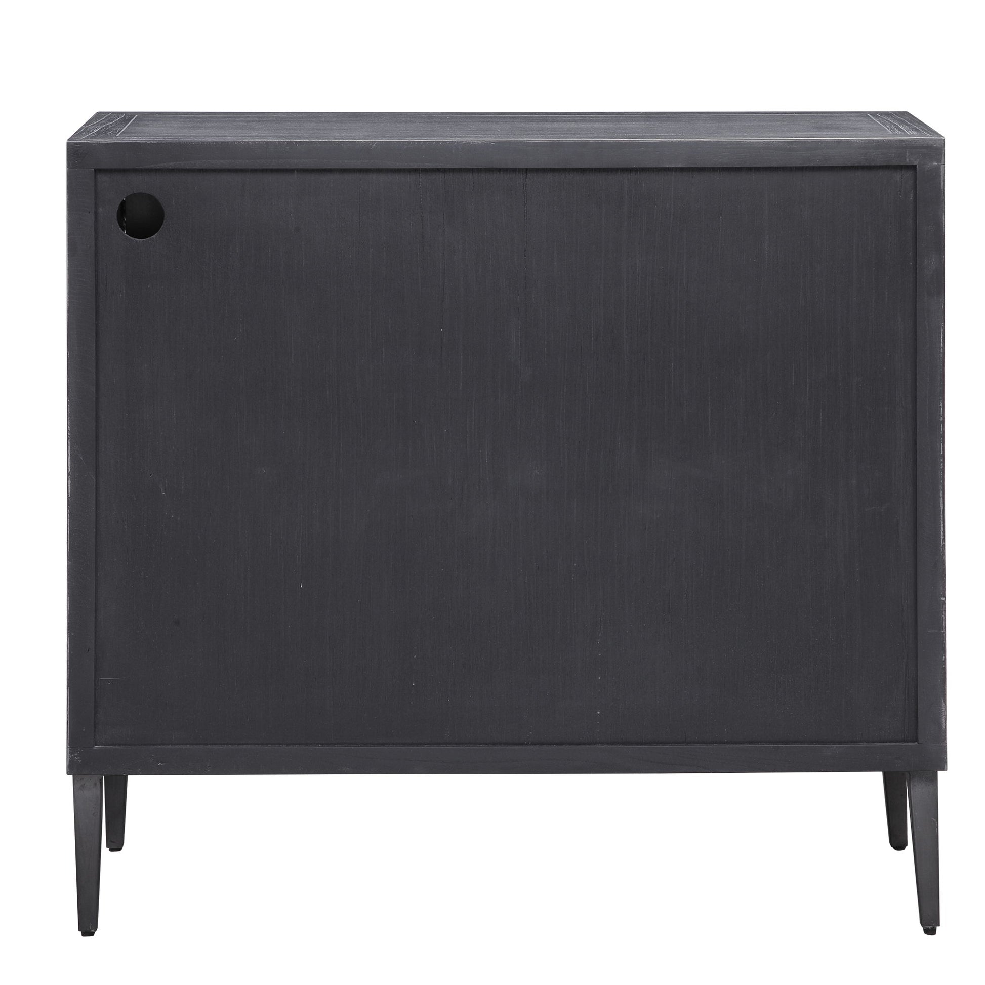 Showcasing A Modern Lodge Style, This Two Door Cabinet Features Hand Pieced Mosaic Doors In Oak Veneer Finished In Light Gray, With A Contrasting Elm Veneer Case Finished In Deep Black With Light Gray Glazing. Accented With Solid Iron Hardware And Legs In Aged Black. Has One Fixed Interior Shelf.