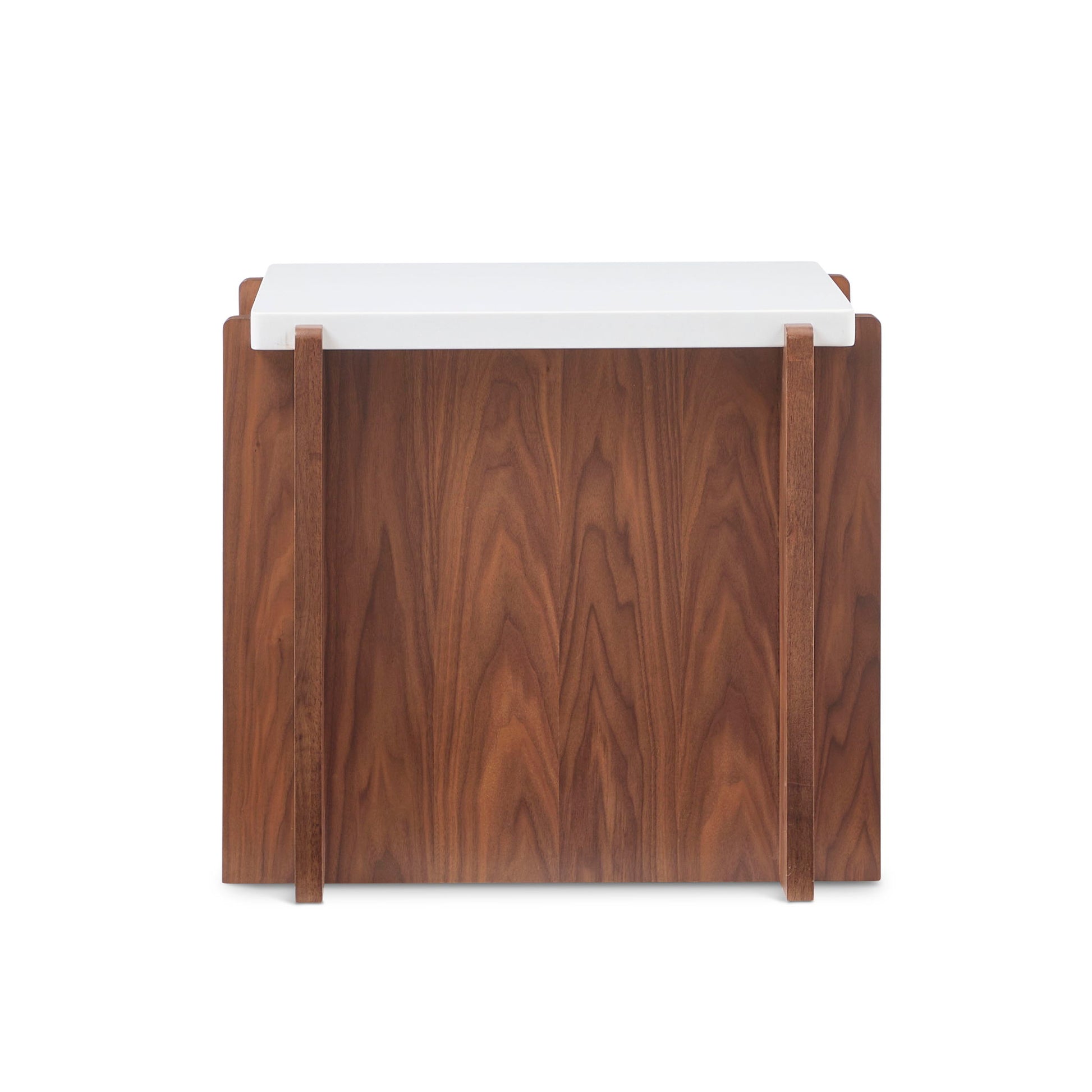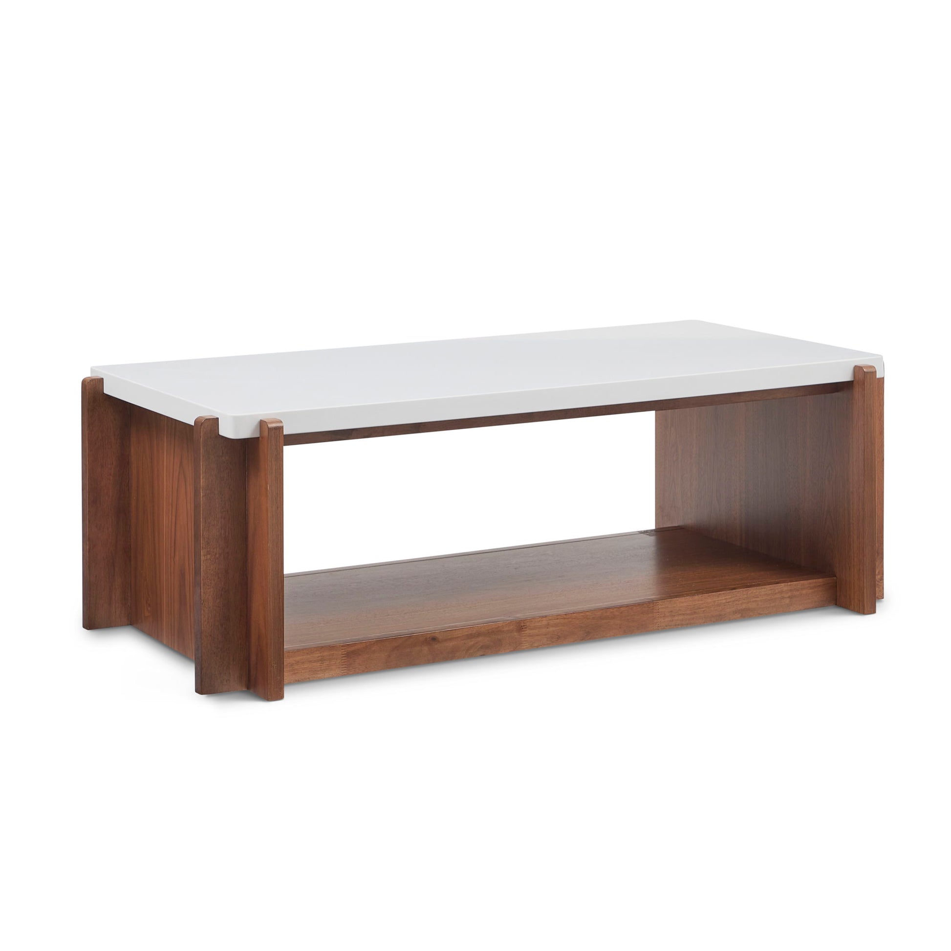 Bring timeless inspiration to your living room. Our Lincoln table was crafted with the works of influential architect Frank Lloyd Wright in mind, to bring timeless style to the present. A clean stone like top perched atop a show-stopping trestle base in a rich walnut finish, this accent table is heirloom quality built for the everyday. Designed for elegance and utility, the Lincoln has an open compartment that can be used for storage. The durability you need, with artisan details you want. It’s all possible with Lincoln.