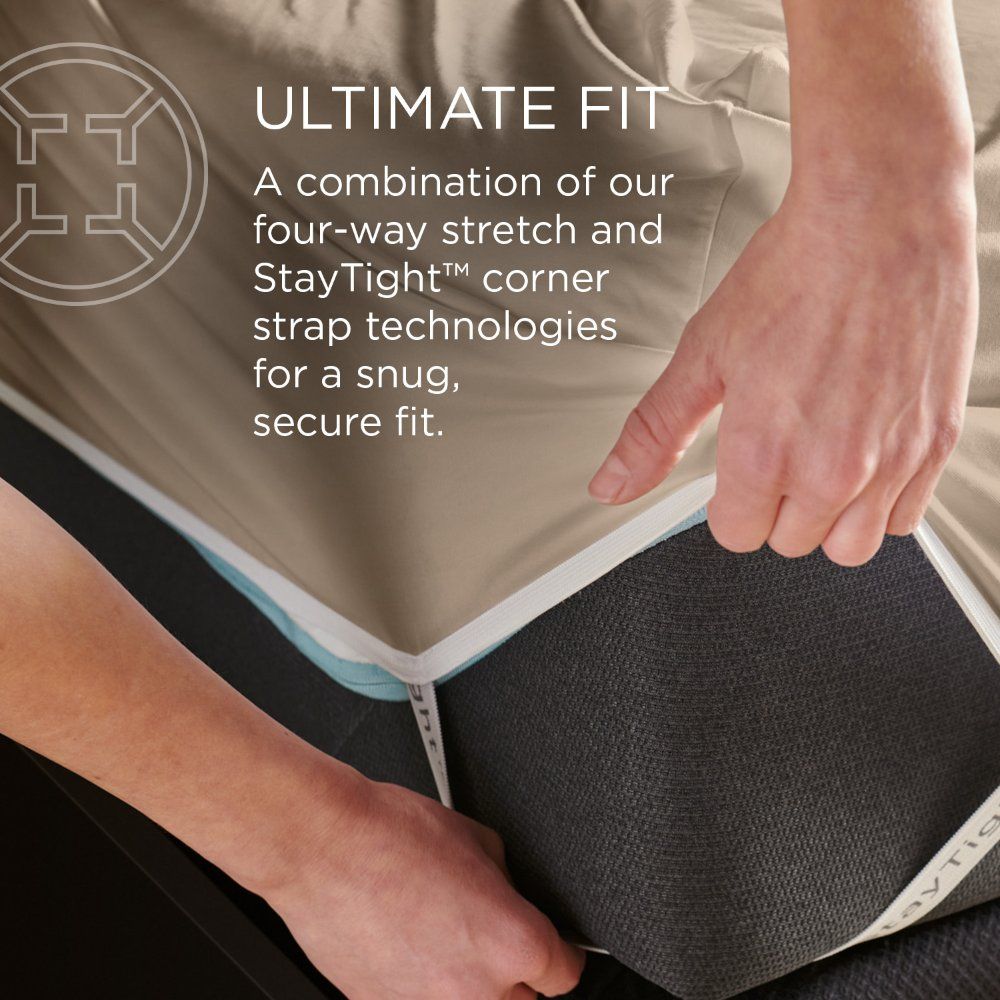 The ultimate match for your Tempur-Pedic (Alt: Perfect fit. Peak performance.) Our most moisture-wicking sheets ever, made from premium, high-stretch, knit fabric that draws moisture away from your body to keep you sleeping comfortably. These sheets are optimized to perfectly complement your Tempur-Pedic mattress, with fourway-stretch knit and our signature StayTight bands for a snug, secure fit, night after night—no bunching, no creeping corners, and no readjusting needed.