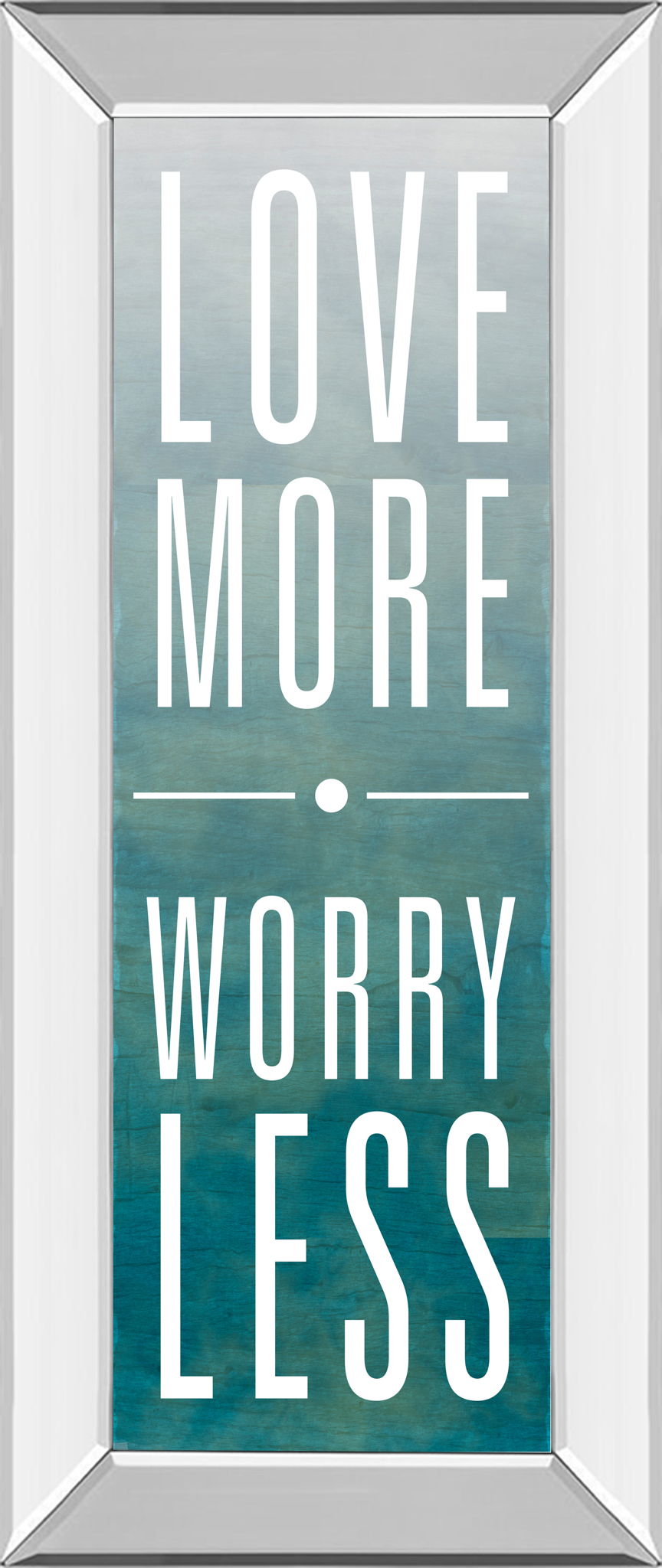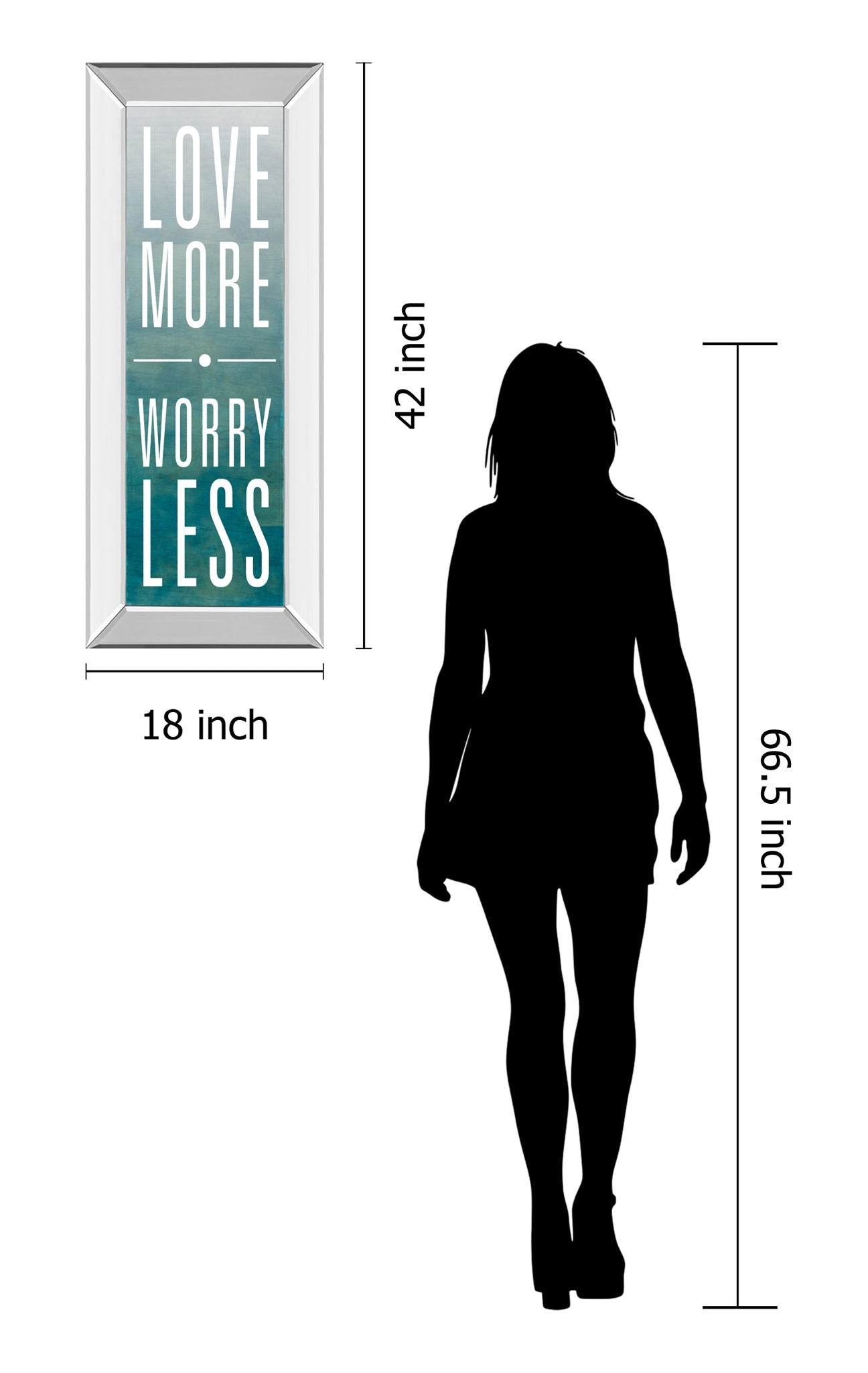 Transform your living space with this inspiring framed wall art that encourages a positive mindset with the message "Love More Worry Less." The calming gradient of blues and grays creates a serene backdrop for the bold white typography, while the mirrored frame adds a sophisticated touch that reflects light and enhances the room’s ambiance. Crafted with premium real glass to protect the vibrant graphic art, this vertical piece is ready to hang and perfect for adding a modern, motivational accent to any living room, bedroom, or office. Its contemporary style and meaningful message make it a timeless addition to your decor.