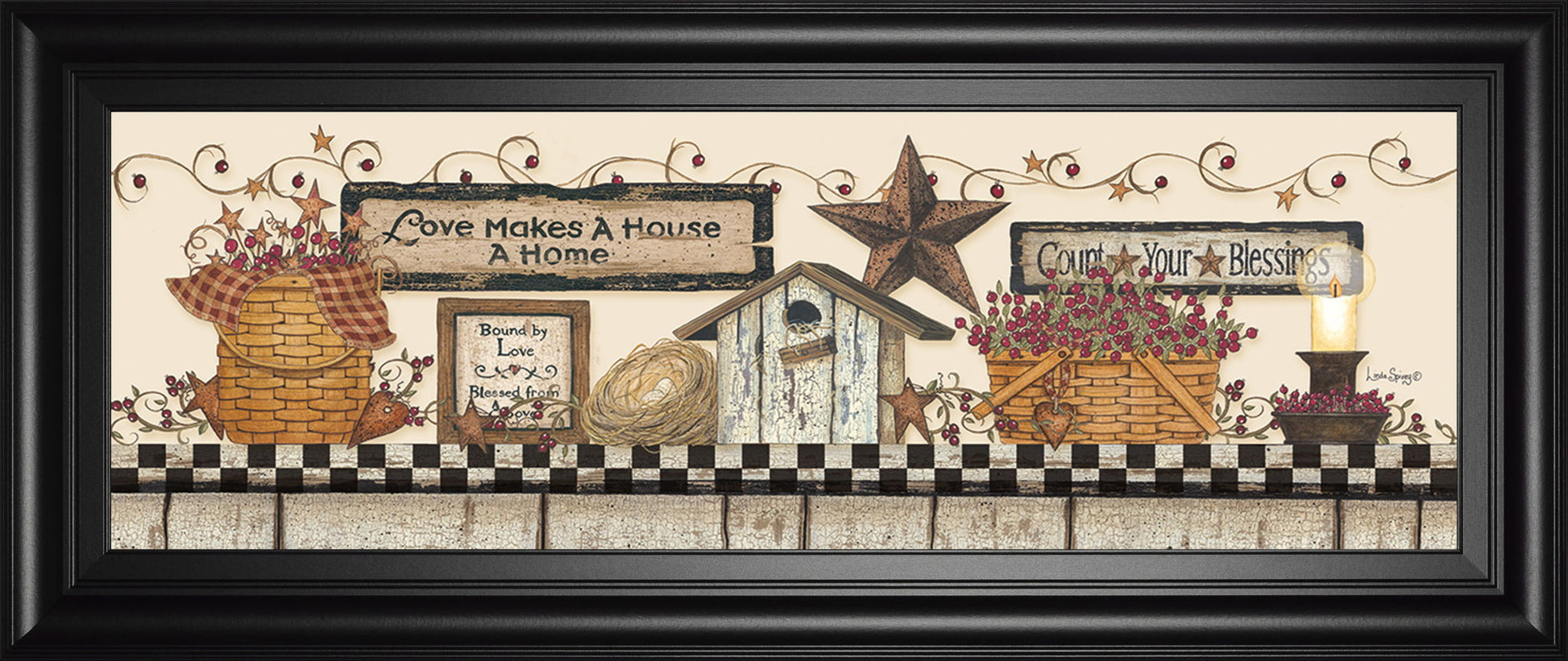 Embrace the heartfelt charm of home with this captivating framed wall art that celebrates love and gratitude. Featuring a rustic country design with woven baskets, a weathered birdhouse, and warm messages like “Love Makes A House A Home” and “Count Your Blessings,” this piece invites you to reflect on the simple joys that fill your space with warmth. The elegant midnight aura frame enhances the vintage appeal, while premium real glass brings out the rich colors and intricate details. Perfectly sized for living rooms, kitchens, or offices, this ready-to-hang artwork adds a cozy, timeless touch that inspires comfort and appreciation every day.