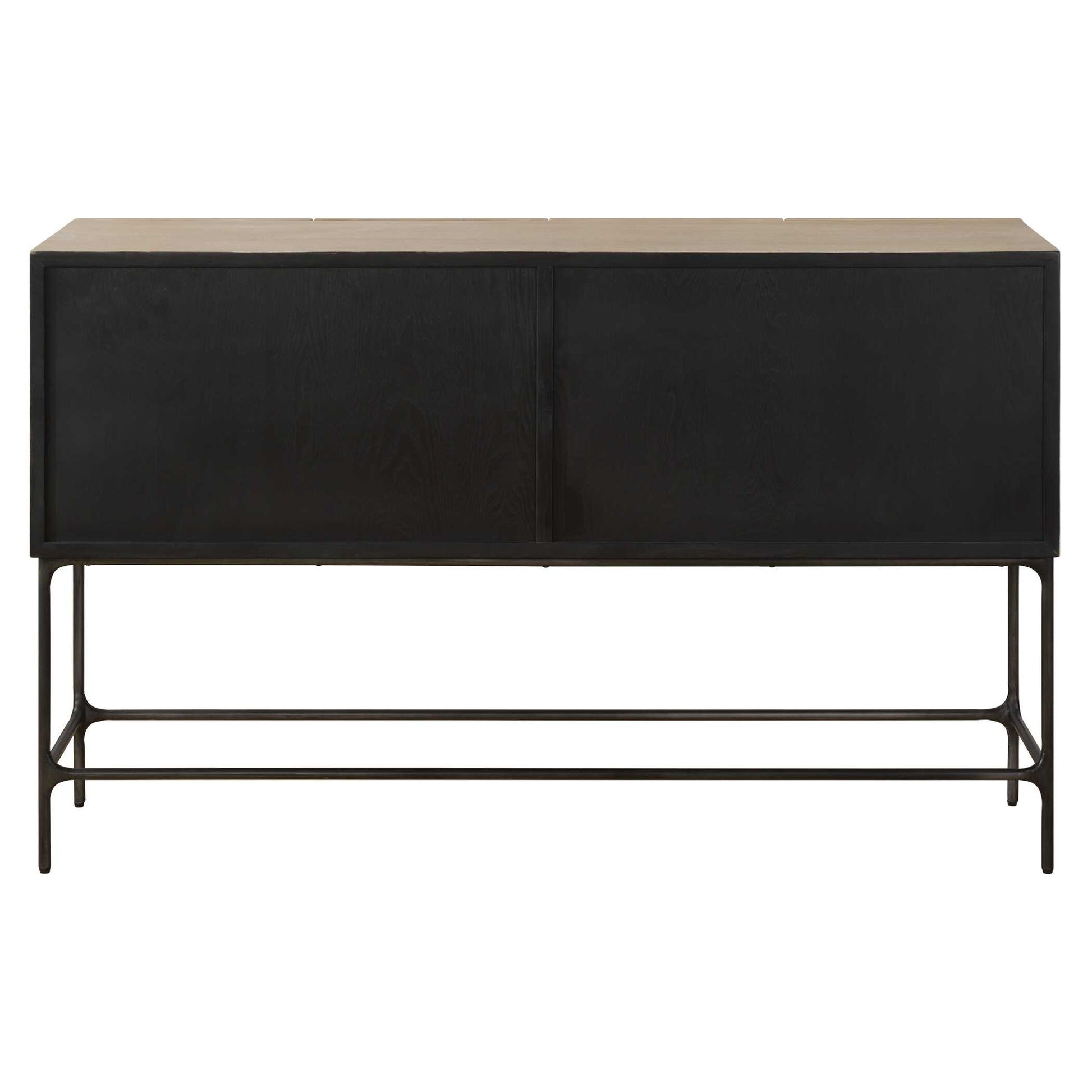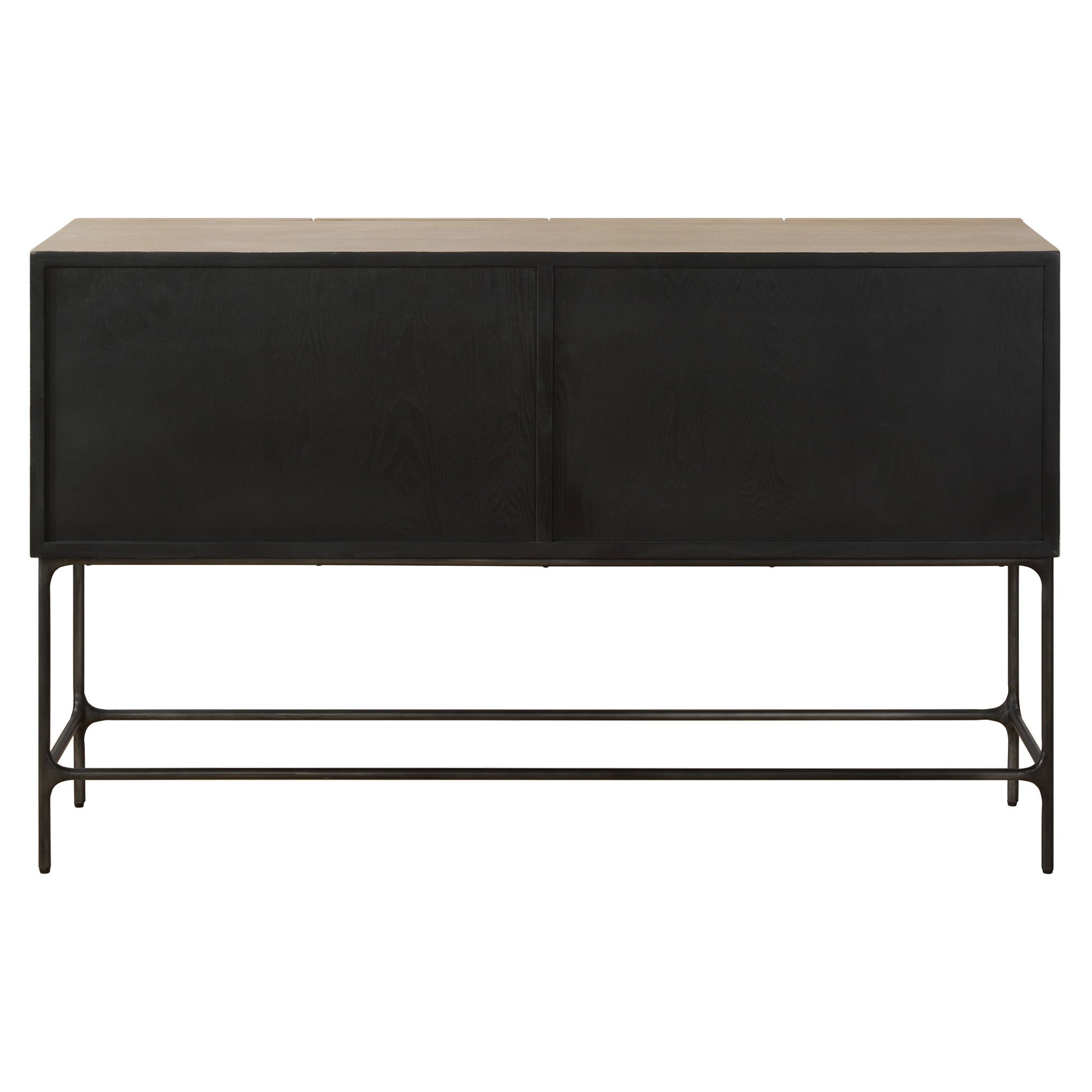 Unique In Design And Function This Four Door Cabinet Can Be Used As A Sideboard, Media Unit, Or Console Cabinet. Crafted From Beautiful Elm Veneer Which Display Deep Rich Grains Highlighting All The Cabinets Intricate Details, Finish, And Design. Cabinet Is Beautifully Contrasted By Its Scooped Door Pulls And Solid Black Iron Legs.