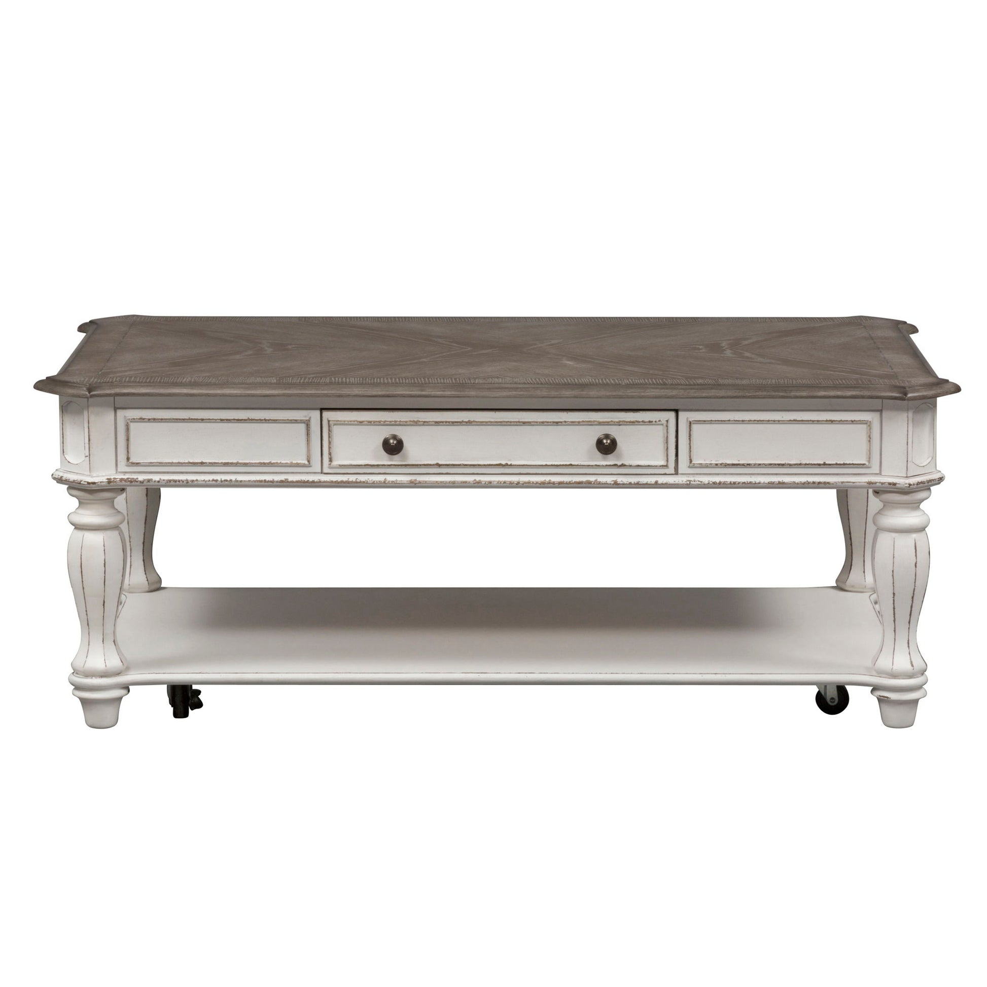 The perfect blend of European design with the Magnolia Manor. Crafted of poplar solids with oak and birch veneers, this piece features a weathered top, one fully stained interior drawer full extension drawer in each table, fancy face top, wood framed drawer fronts, bead molding, canted corners, faceted turned legs, cocktail offers casters that make rearranging effortless, antique pewter knob hardware and a bottom shelf for additional storage. Warm finishes and artistic distressing along with grand scale create a piece to be passed to generations. Kit consists of one cocktail table and two end tables.