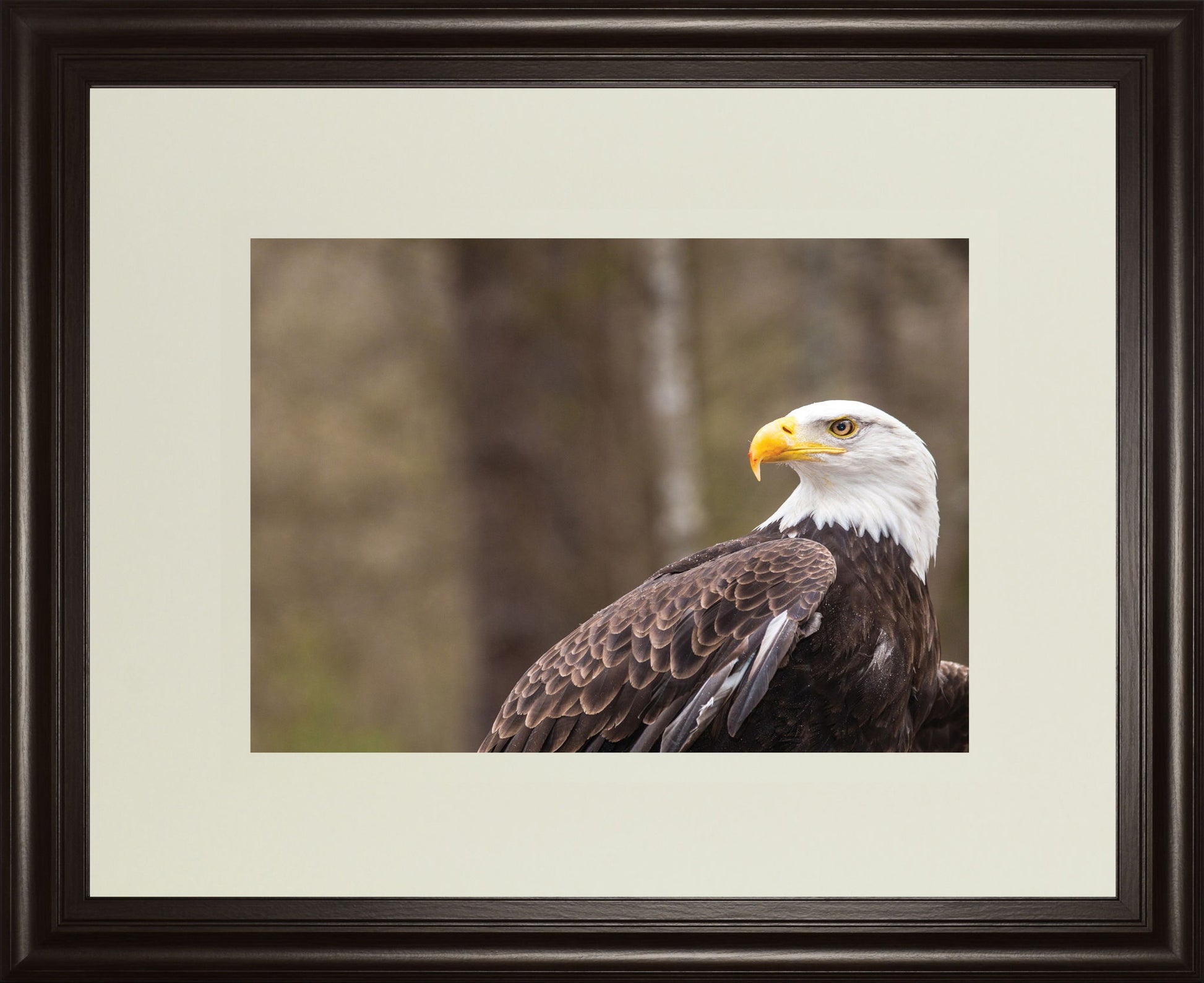 Discover the commanding presence of the regal eagle captured in this exquisite framed wall art. The photograph highlights the bird's piercing gaze and the intricate layering of its feathers, set against a softly blurred natural backdrop that enhances its majestic aura. Encased in a rich dark chocolate frame with a double-matted cream border, this piece adds depth and elegance to any living room or office. Ready to hang and protected by premium real glass, it invites the timeless beauty and grandeur of nature into your space, making it a striking focal point that inspires awe and admiration.