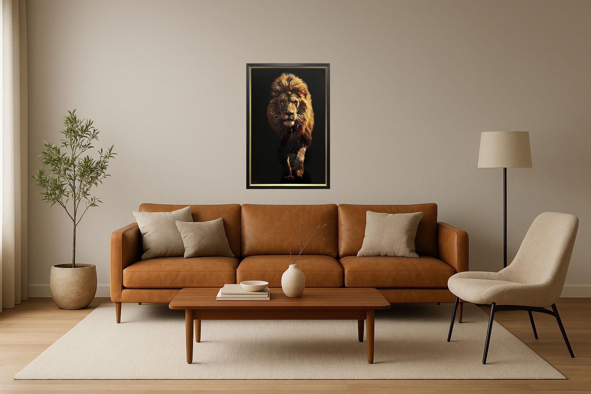 Experience the commanding presence of the "Lion Walking," a striking graphic art piece printed on a durable gloss canvas. This contemporary artwork captures the majestic lion in mid-stride, its detailed mane and intense gaze enhanced by hand-applied accents that add texture and depth. The double frame, finished in elegant black and gold, complements the rich, warm tones of the lion against a deep black background, creating a sophisticated focal point for any living room or office. Ready to hang with professional mounting hardware, this piece brings both power and refinement to your space.