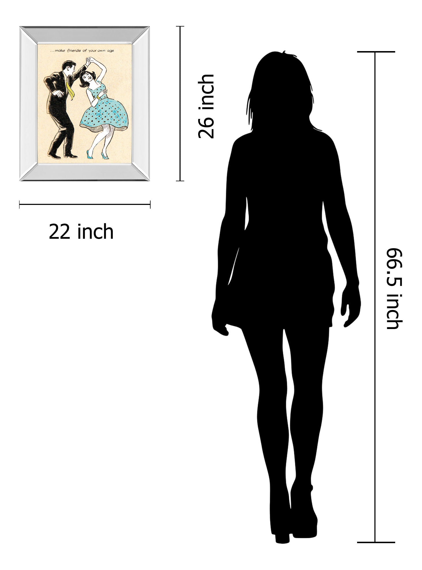 Step back into a playful mid-century moment with this charming framed wall art featuring a dancing couple and the whimsical phrase, “make friends of your own age.” The vintage-inspired graphic is brought to life with vibrant black, blue, yellow, and beige hues, perfectly balanced by a sleek mirrored frame that adds a modern touch. Protected by real glass, the artwork’s crisp details and lively colors make it an engaging focal point in any living room, office, or den. Ready to hang and crafted with care, this piece blends humor and elegance, inviting smiles and sparking conversations wherever it’s displayed.