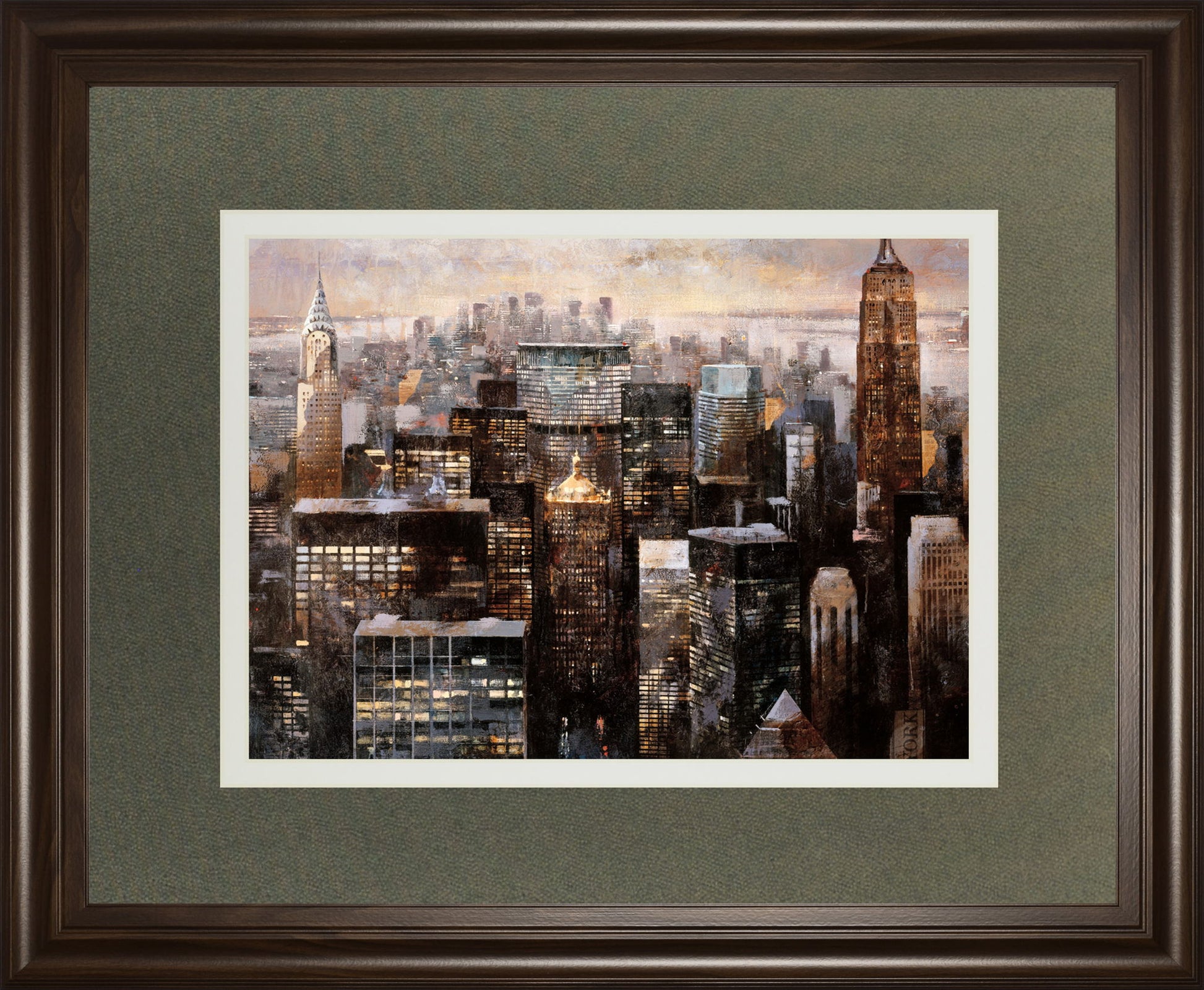 Step into the mesmerizing glow of a city at dusk with this evocative portrayal of Manhattan. The artwork captures the intricate details of the skyline as daylight fades, blending warm hues with the emerging lights of towering skyscrapers. Framed in a rich brown frame with a soft cream mat, this piece adds a touch of urban sophistication and timeless elegance to any living room or office space. Protected by real glass, it ensures vivid colors and sharp detail, inviting you to lose yourself in the vibrant pulse of city life every time you glance its way.