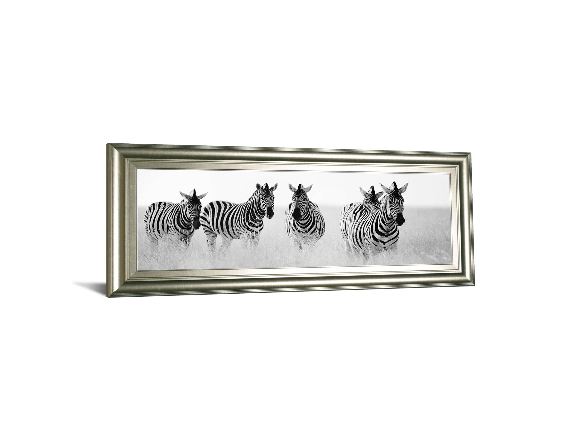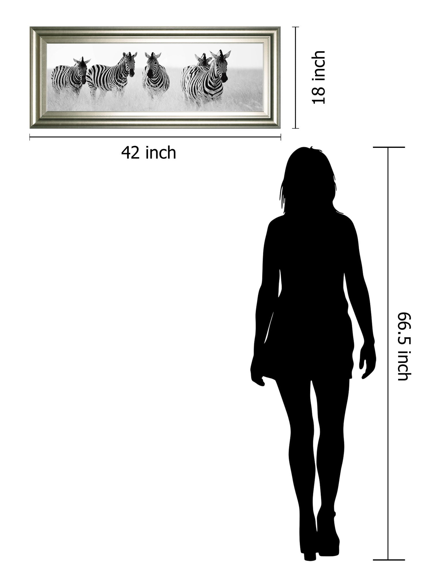 Zebra Gathering invites you into a quiet moment on the plains where five zebras stand poised amidst tall grasses, their striking black and white stripes creating a captivating contrast against a soft, misty backdrop. This contemporary photographic print, framed in a sleek silver MDF frame with crystal-clear glass, brings a serene touch of the wild into your living room, office, or bedroom. Expertly crafted in the USA, it adds both natural elegance and a sophisticated focal point to your space, encouraging a peaceful connection with nature's subtle beauty.