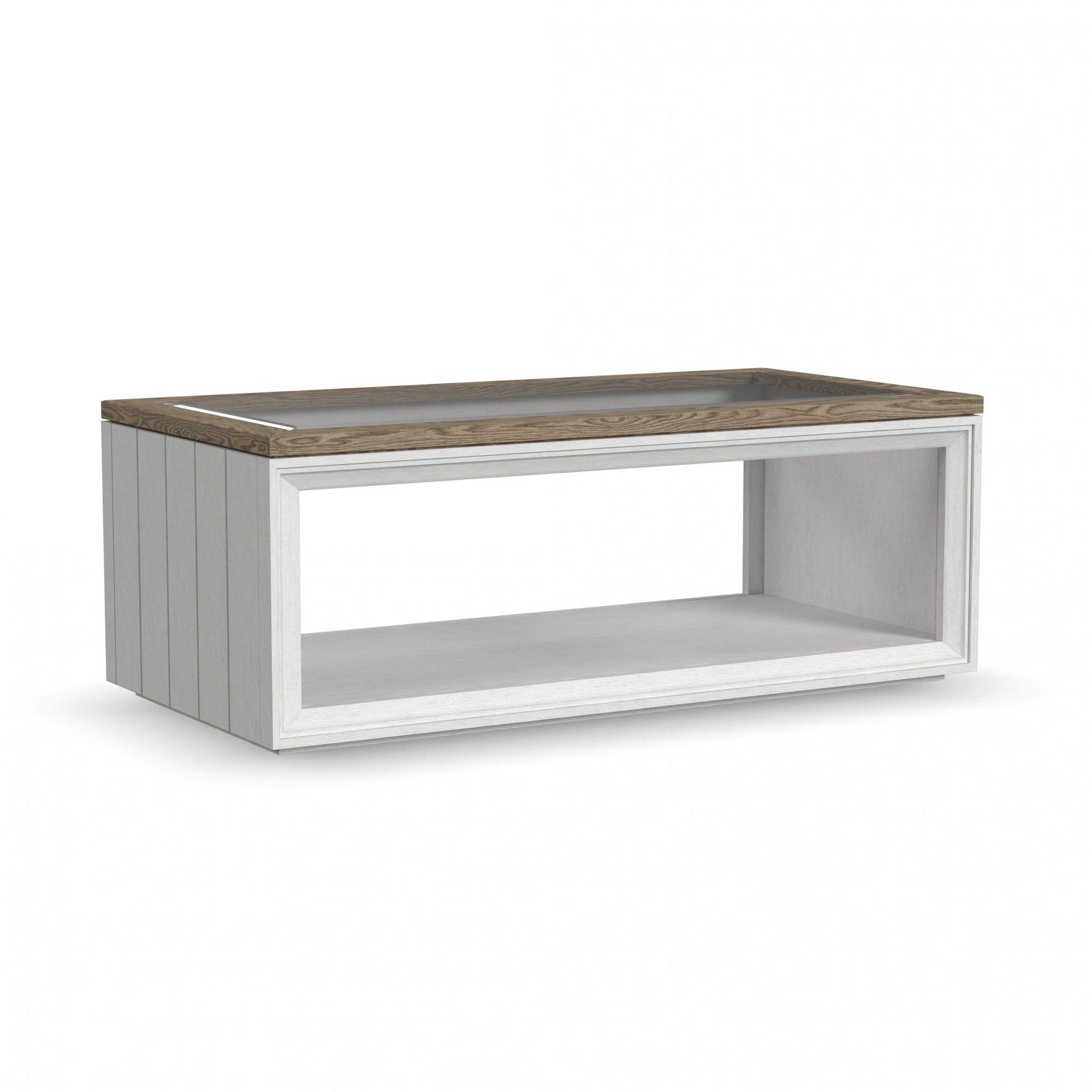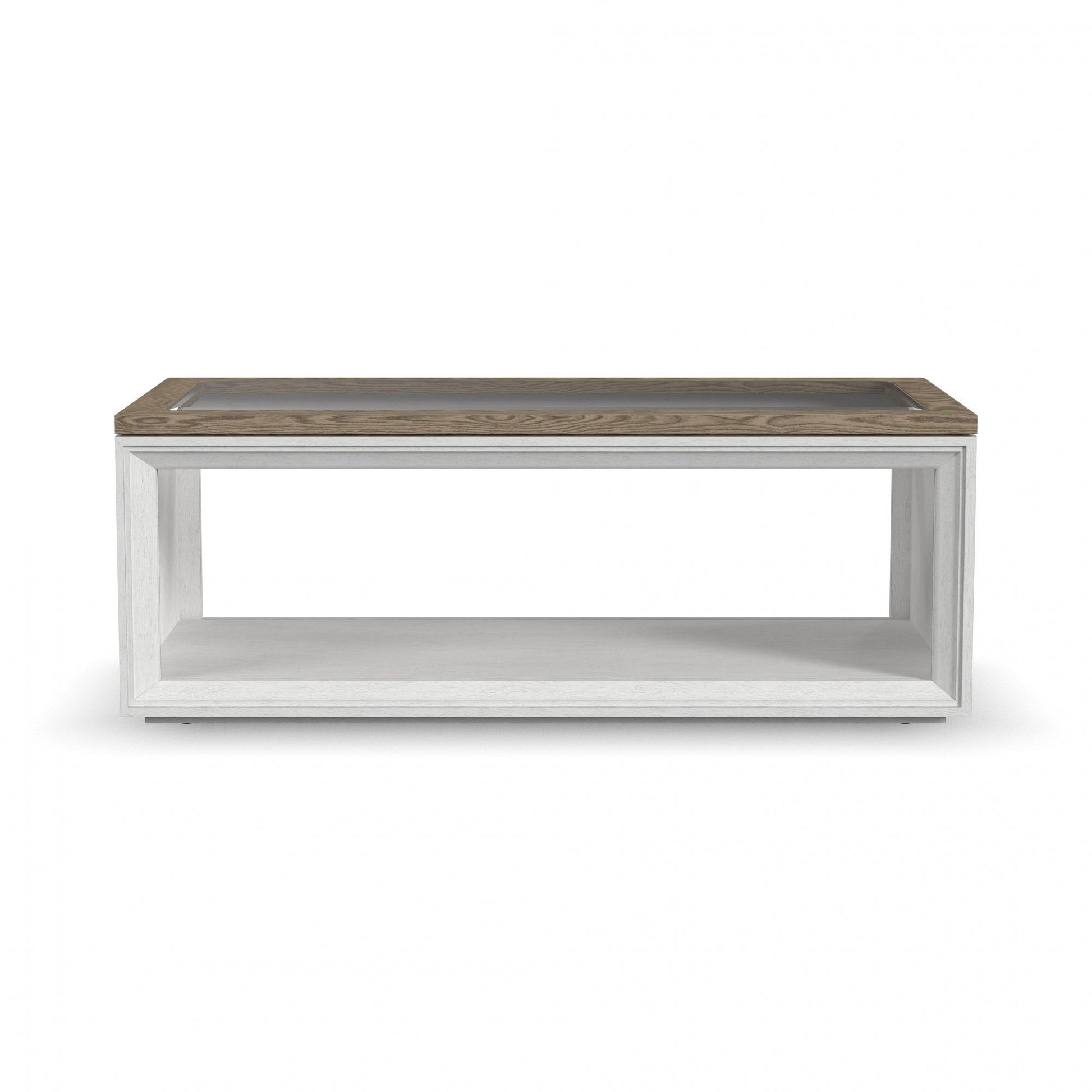 - Subtly distressed white finish with a gray parquet stained top