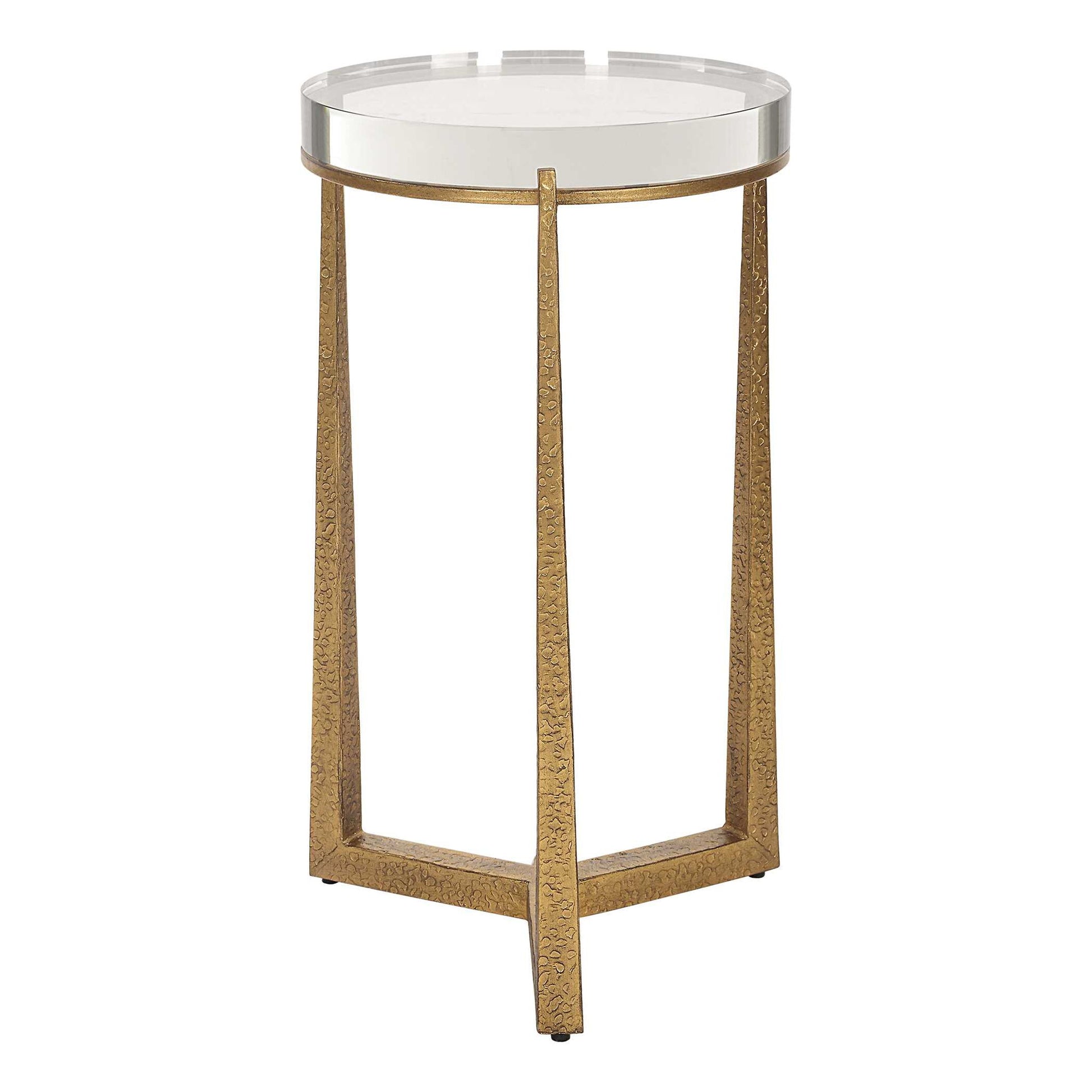This Elegant Accent Table Adds A Touch Of Luxury To Any Room. The Textured Antique Gold Finished Iron Legs Perfectly Support And Accentuate The Thick Round Crystal Top.