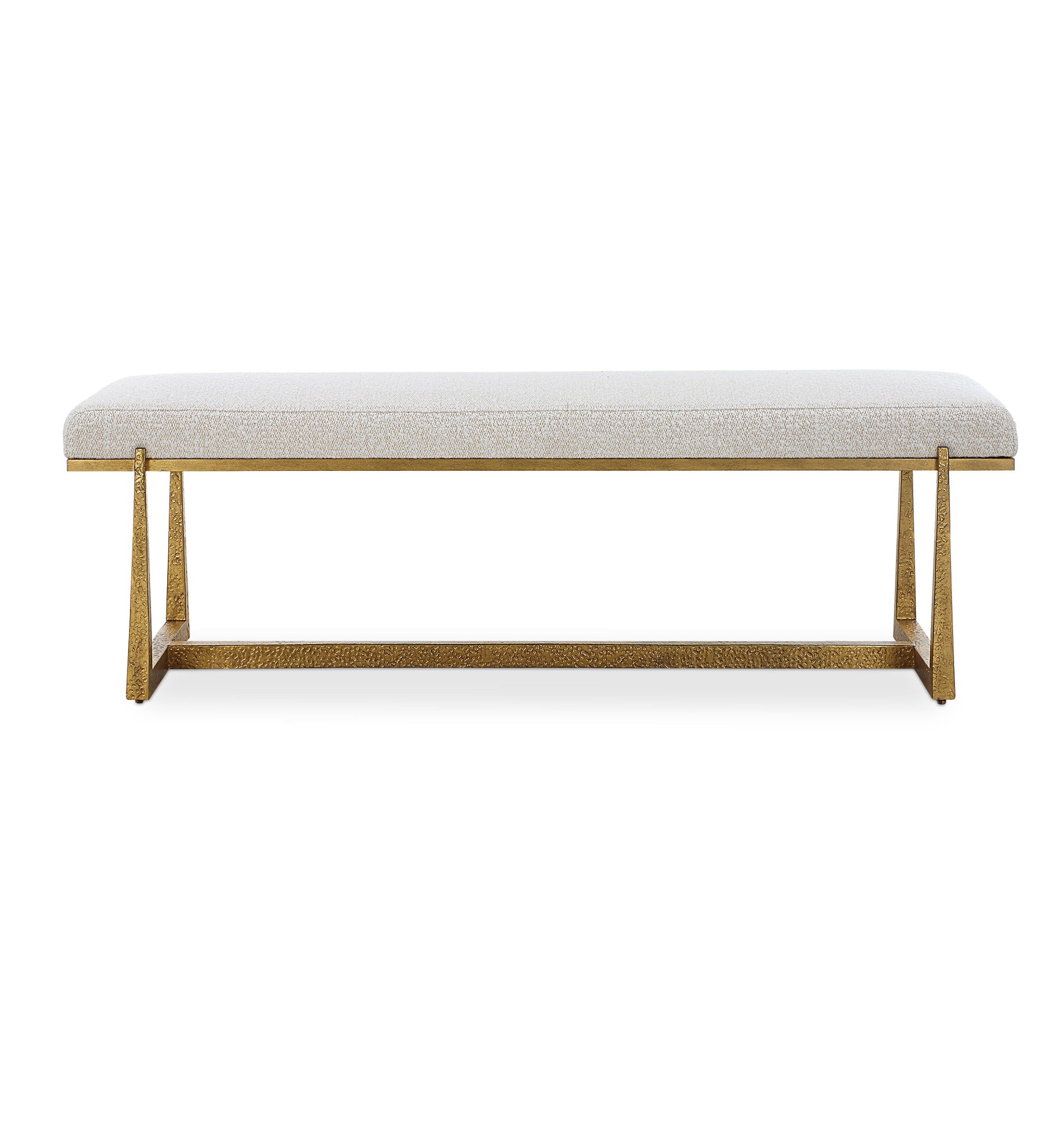 This Elegant Bench Adds A Touch Of Luxury To Any Room. The Textured Antique Gold Finish Iron Legs Perfectly Support And Accentuate The Upholstered Top In A Driftwood Toned Polyester Blend With Wool-like Texture.