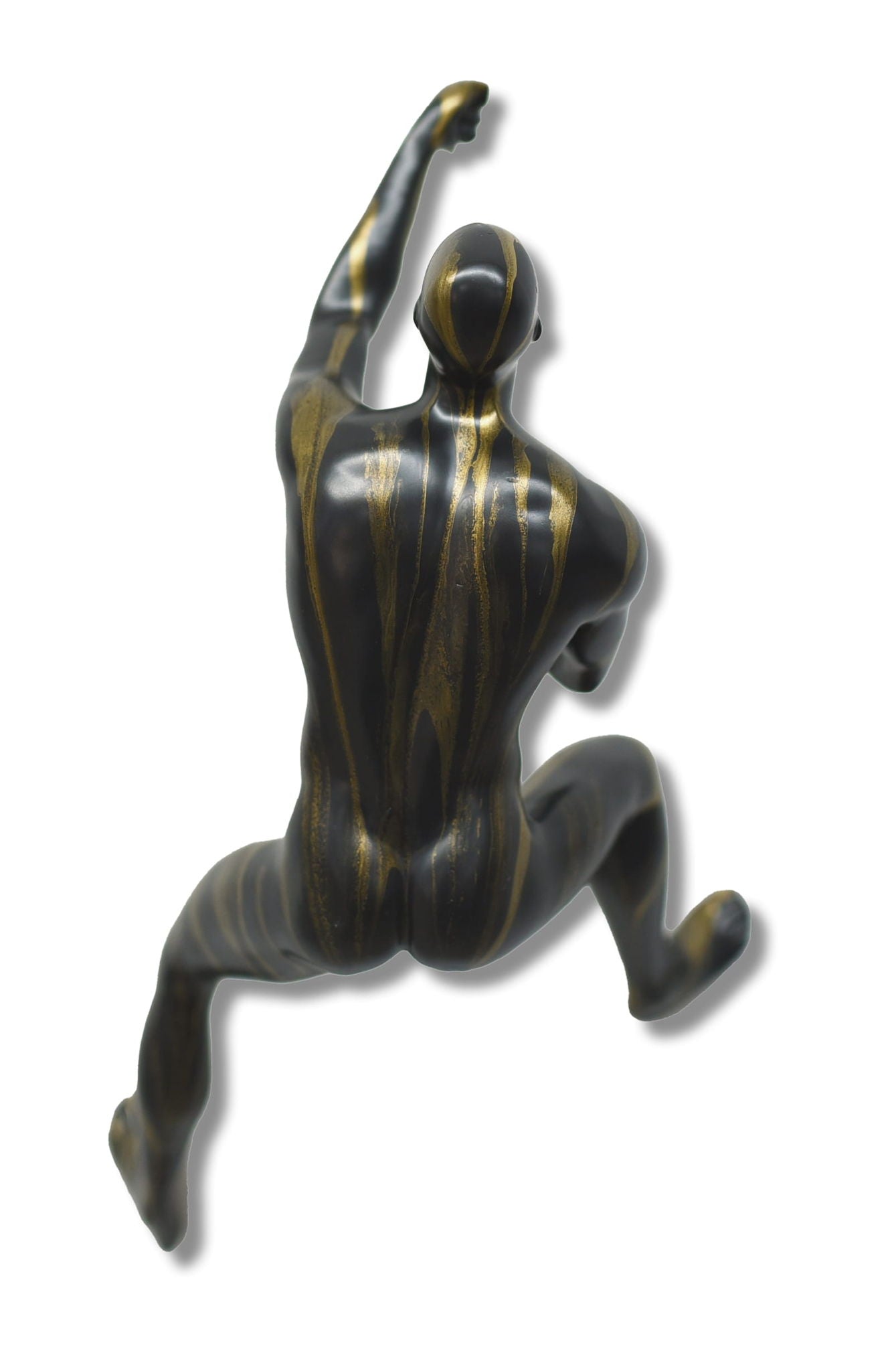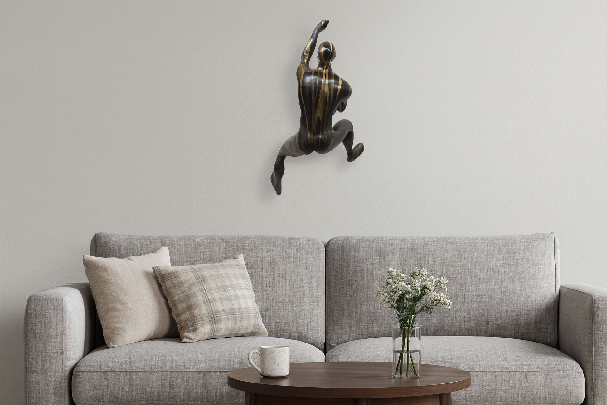 This dramatic climbing figure sculpture captures the dynamic energy of human motion in a sleek black and gold finish. Crafted from hand-painted polyresin, each piece offers unique charm and personality, making it a striking accent for any wall. Designed to hang off the wall or stand alone, it adds playful depth and layered style to living rooms, offices, or entryways. Ready to display with professional mounting hardware, this contemporary sculpture also supports a meaningful cause by donating a meal to a hungry child with every purchase.