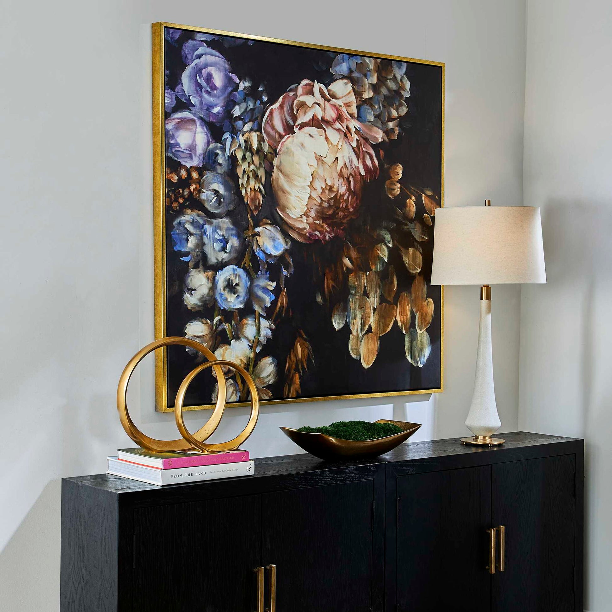 Giclee On Canvas, This Floral Piece Features A Dramatic Black Background With Flowers Of Blue, Lavender, And Peach Colors Highlighted By White Accents. This Piece Is Surrounded By A Simple Solid Wood Gallery Frame With Gold Finish. Each Canvas Is Proudly Handcrafted And Printed In The USA. Artwork By Liz Jardine.
