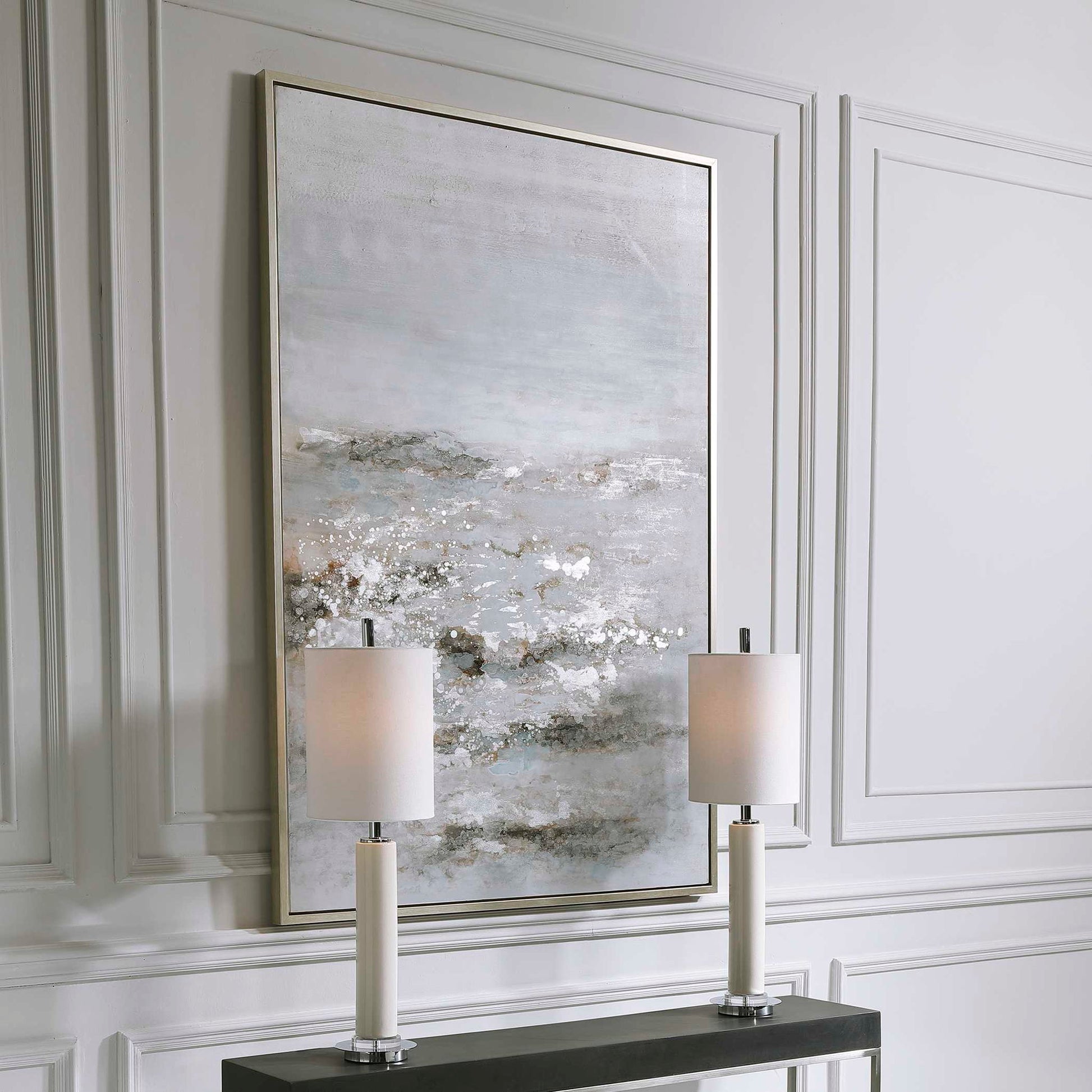 A Fresh Take On Abstract Paintings, This Hand Painted Artwork Showcases A Neutral Color Palette With Brown, Taupe And White Tones Accented By Pops Of Light Blue. The Artwork Is Complemented By A Silver Gallery Frame. Due To The Handcrafted Nature Of This Artwork, Each Piece May Have Subtle Differences.