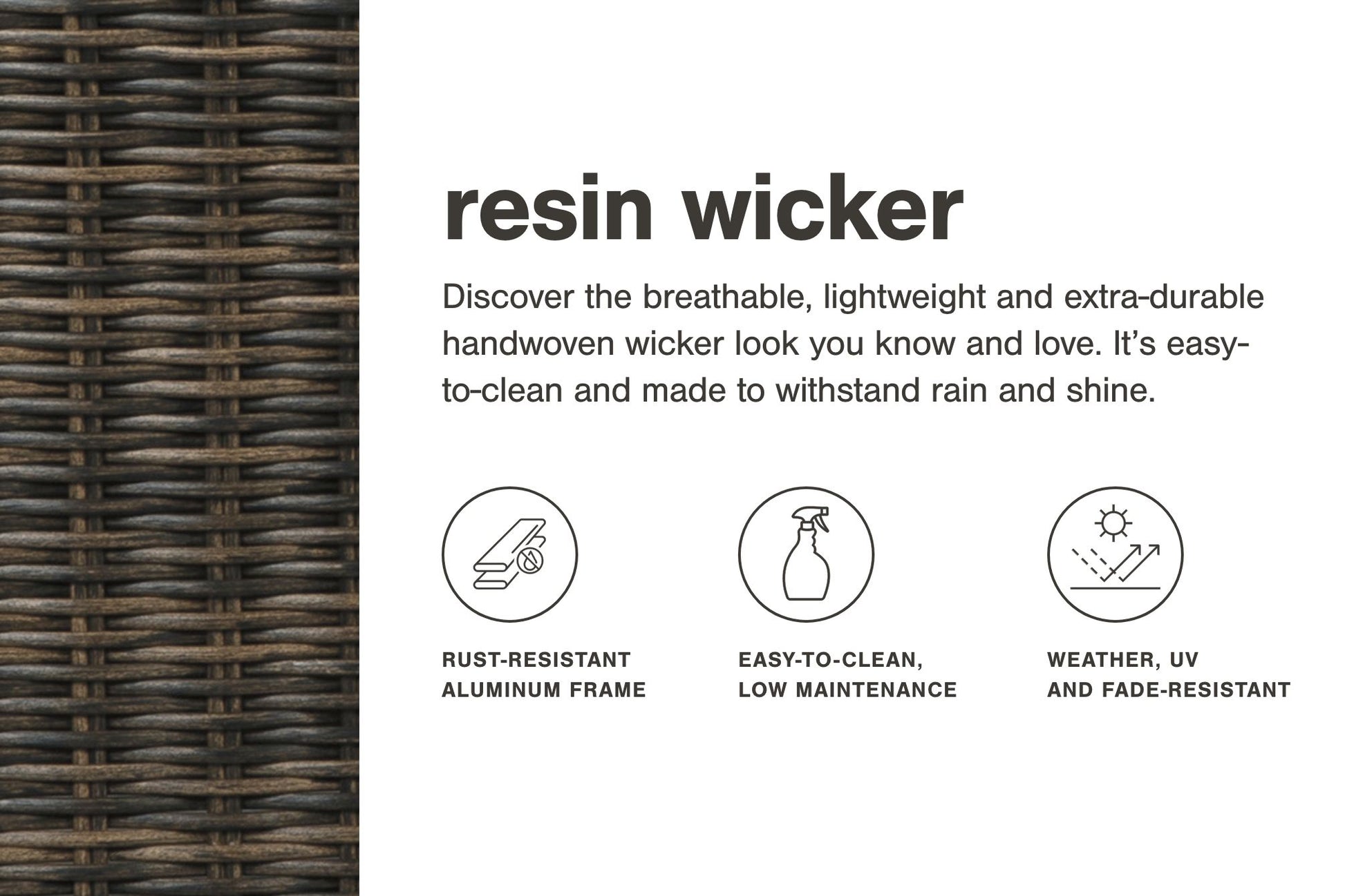- All-weather, handwoven resin wicker over rust-proof aluminum frame