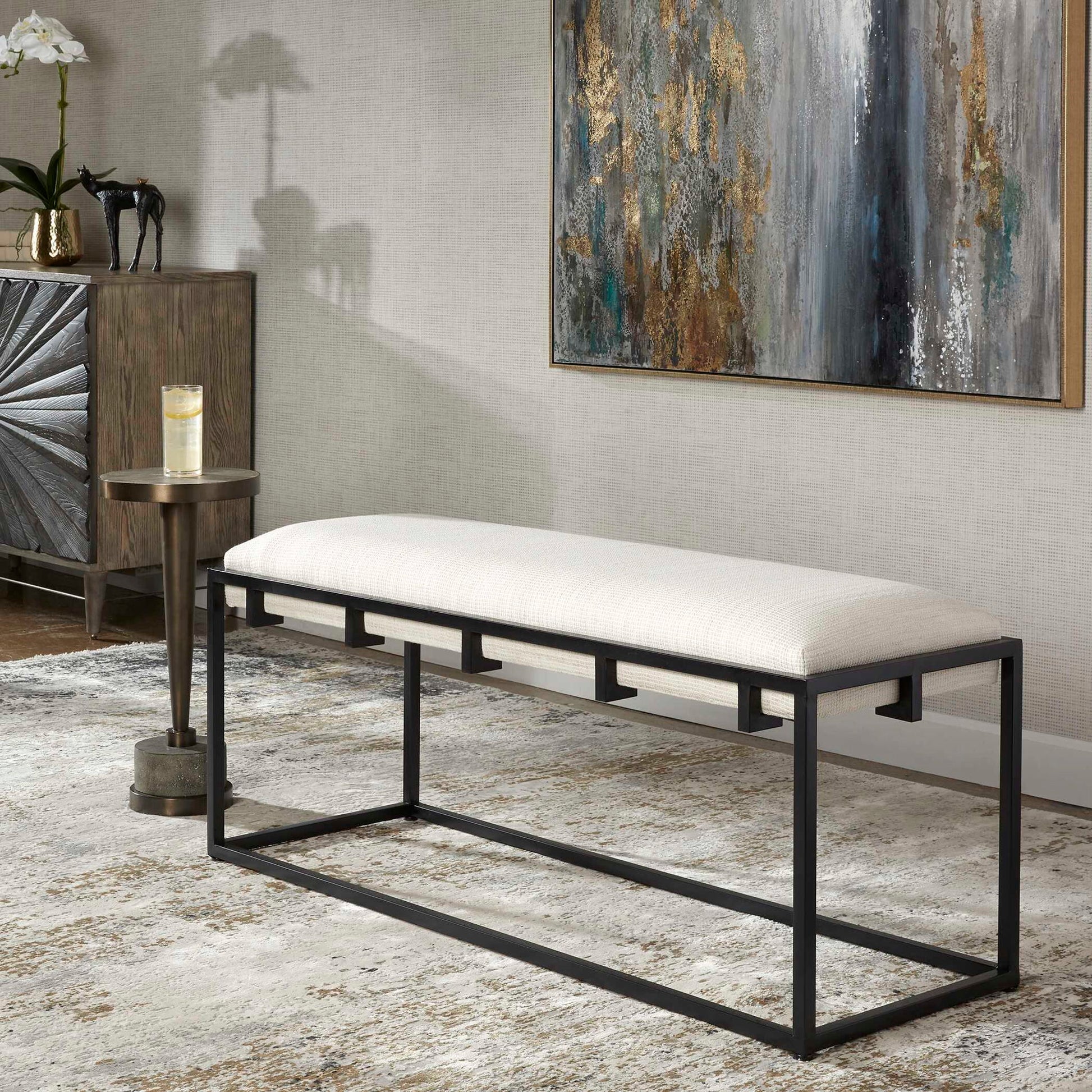 A Classic And Sophisticated Color Combination, This Bench Features A Sleek Matte Black Iron Frame And Is Paired With A Plush Upholstered Seat In A Crisp White Waffle Textured Polyester.