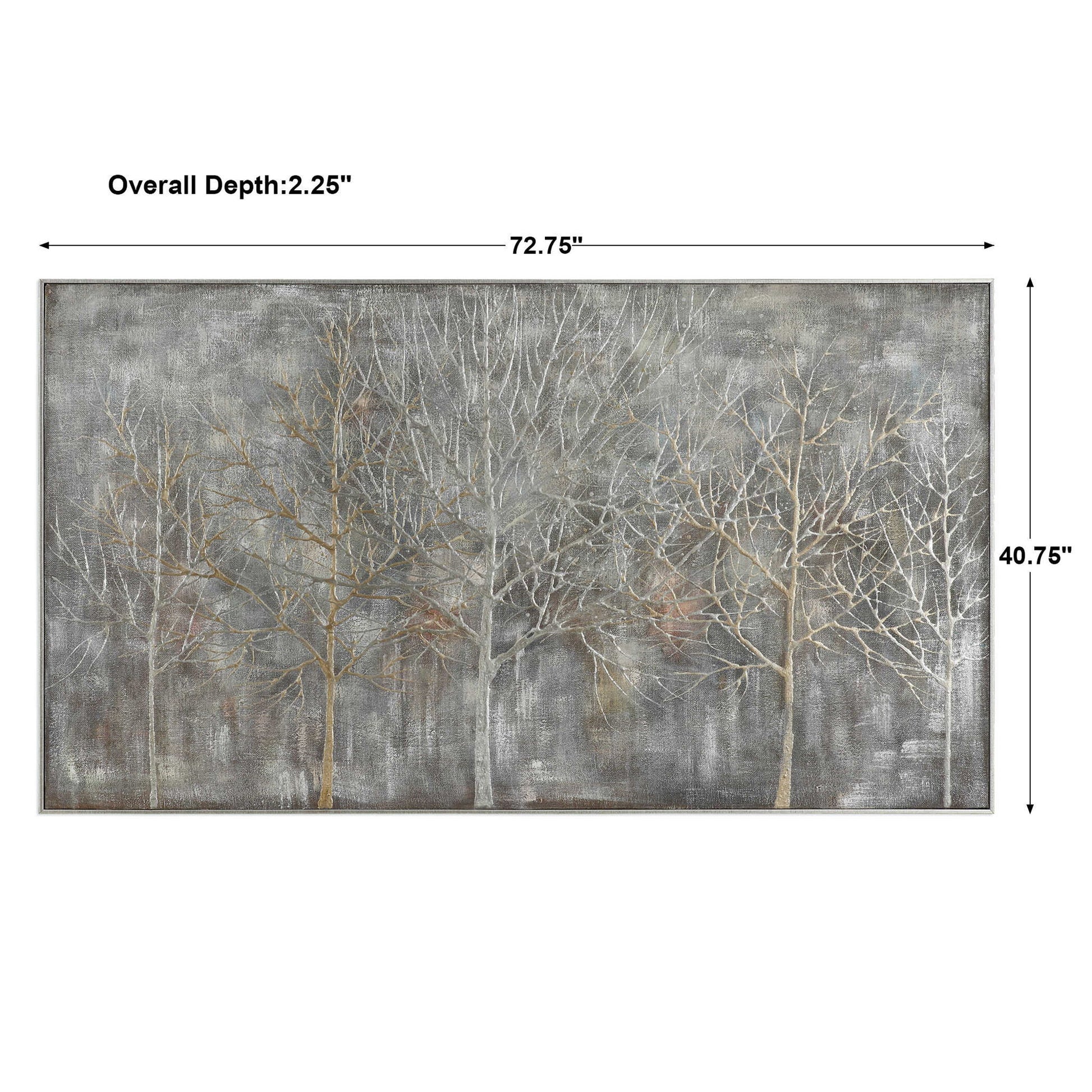 Contemporary In Design, This Hand Painted Landscape On Canvas Features Heavily Textured Accents, Which Create A Raised, Dimensional Effect. Gray, Gold, And Silver Hues Form A Versatile, Neutral Color Palette. Each Canvas Is Stretched And Attached To Wooden Stretchers And Surrounded By A Petite, Champagne Silver Leaf Gallery Frame. Due To The Handcrafted Nature Of This Artwork, Each Piece May Have Subtle Differences.