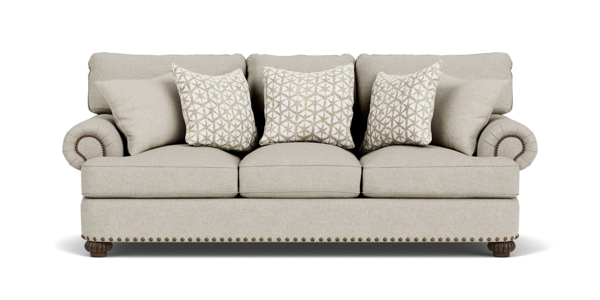 Prominently rolled arms and a padded front rail give Patterson its welcoming appearance. Overstuffed seat and back cushions on a large frame make it difficult to resist curling up on this piece. Fluted bun feet and optional nailhead trim add the finishing touches to Patterson.
