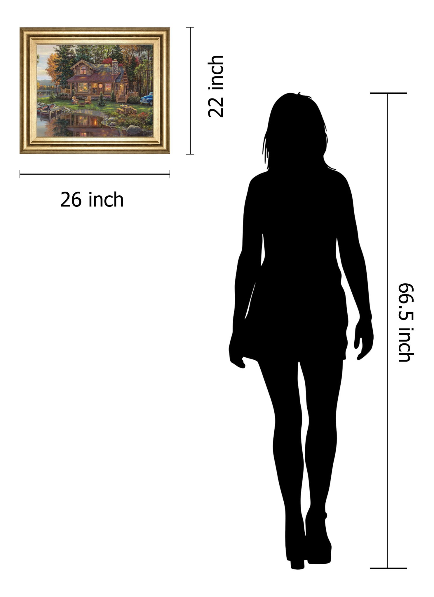 Escape to a peaceful lakeside haven with this beautifully framed artwork that captures the warm glow of a cozy log cabin surrounded by vibrant autumn trees. The scene invites you to relax by the water’s edge, where the gentle reflections and soft light create a serene atmosphere. Featuring a wide gold frame and premium glass, this piece brings traditional elegance and a sense of calm to any living room, den, or cabin, making it a perfect retreat for quiet moments and cherished memories.