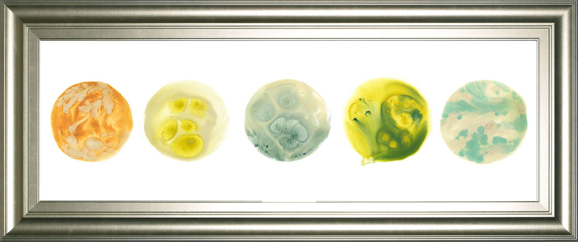 Celestial Orbs invites you into a serene cosmic journey with its five abstract planetary forms rendered in soothing hues of orange, yellow, green, and blue. This contemporary mixed media piece is encased in a sleek silver frame with real glass, enhancing the vibrant colors and delicate textures that evoke the mysteries of the universe. Perfectly sized for living rooms or offices, it adds a sophisticated touch of modern artistry and celestial inspiration, ready to hang and elevate your space with its elegant presence.