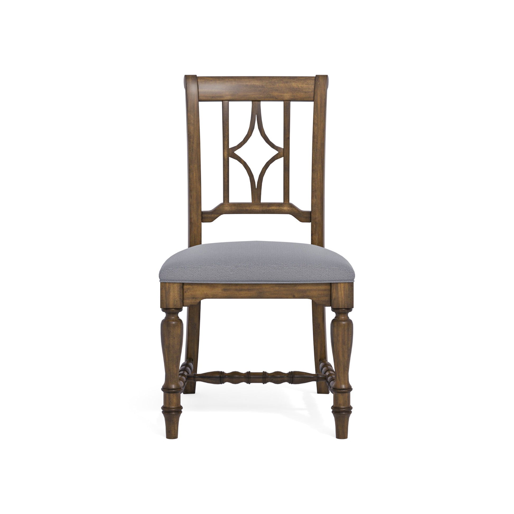 Designed to complement our Plymouth dining tables with a coordinating cottage look, this charming dining chair features an appealing open back design with a diamond-shaped detail, intricately carved trestles and turned legs for added vintage character. Available in a distressed medium brown finish, each chair is upholstered in a durable and cleanable coordinating fabric, providing comfort for long periods of sitting.