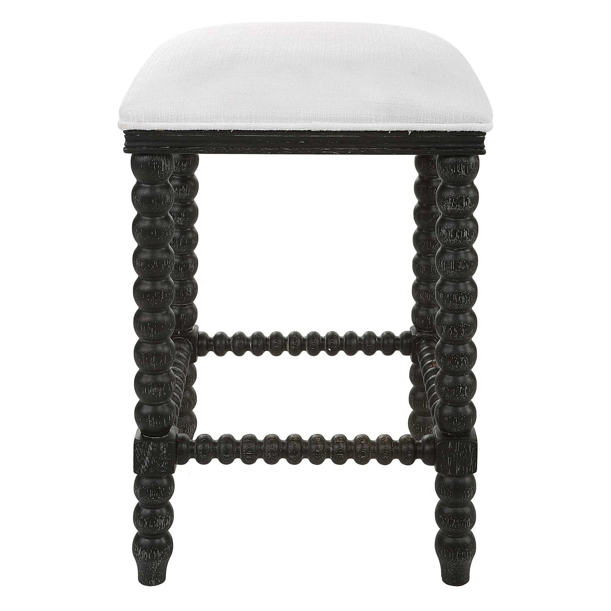 A Stylish And Classic Counter Stool Featuring Spindle Turned Legs And Carved Trim Finished In A Stylish Black Ceruse Stain. Plush Seat Is Tailored In A Crisp White Performance Fabric.