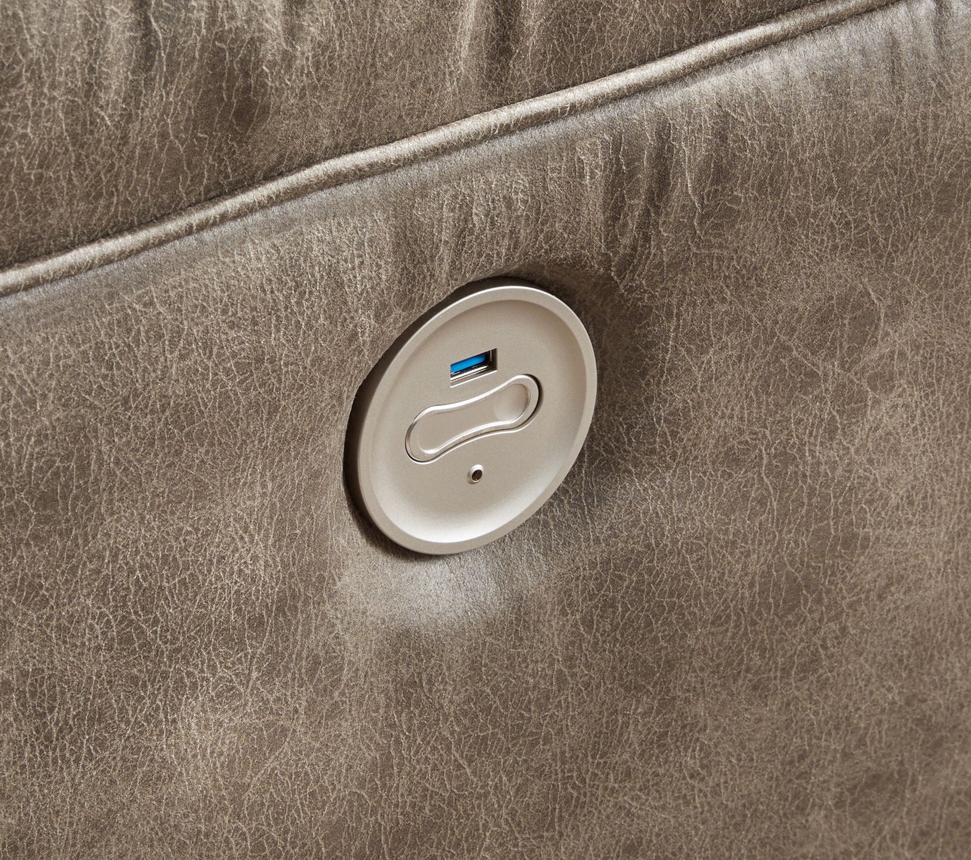 This power reclining sectional is designed exclusively for those who are serious about R&R. Its overstuffed cushions and pillow top arms feel oh-so-plush, and the faux leather upholstery accented with jumbo stitching is silky soft. Go from upright to reclined relaxation with just one touch. A clever center console provides storage and keeps drinks at the ready.