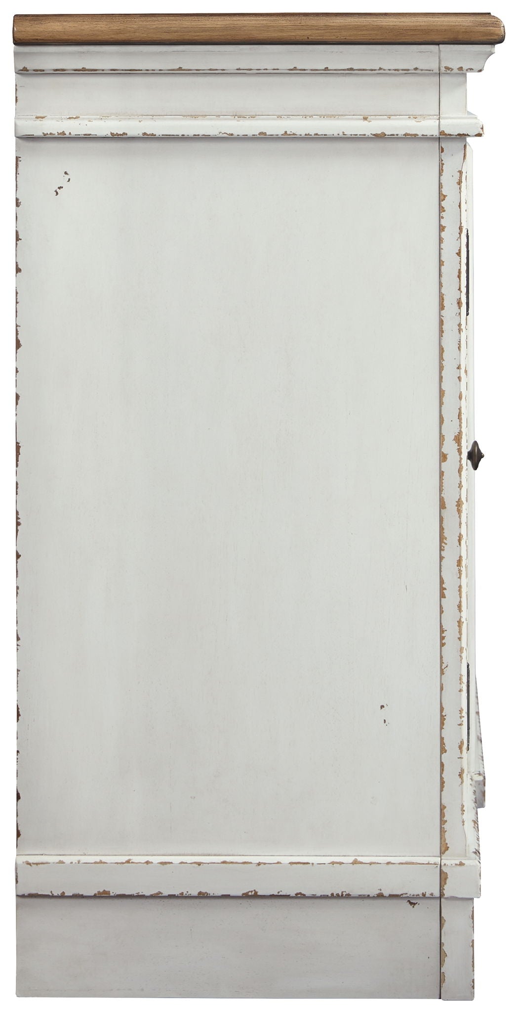 Elevating the art of traditional cottage styling, this TV stand is sure to serve you beautifully for years to come. Antiqued two-tone finish blends a chipped white with a distressed wood tone top for added charm. Cabinet door features inset mirror with filigree moulding for a fanciful twist.