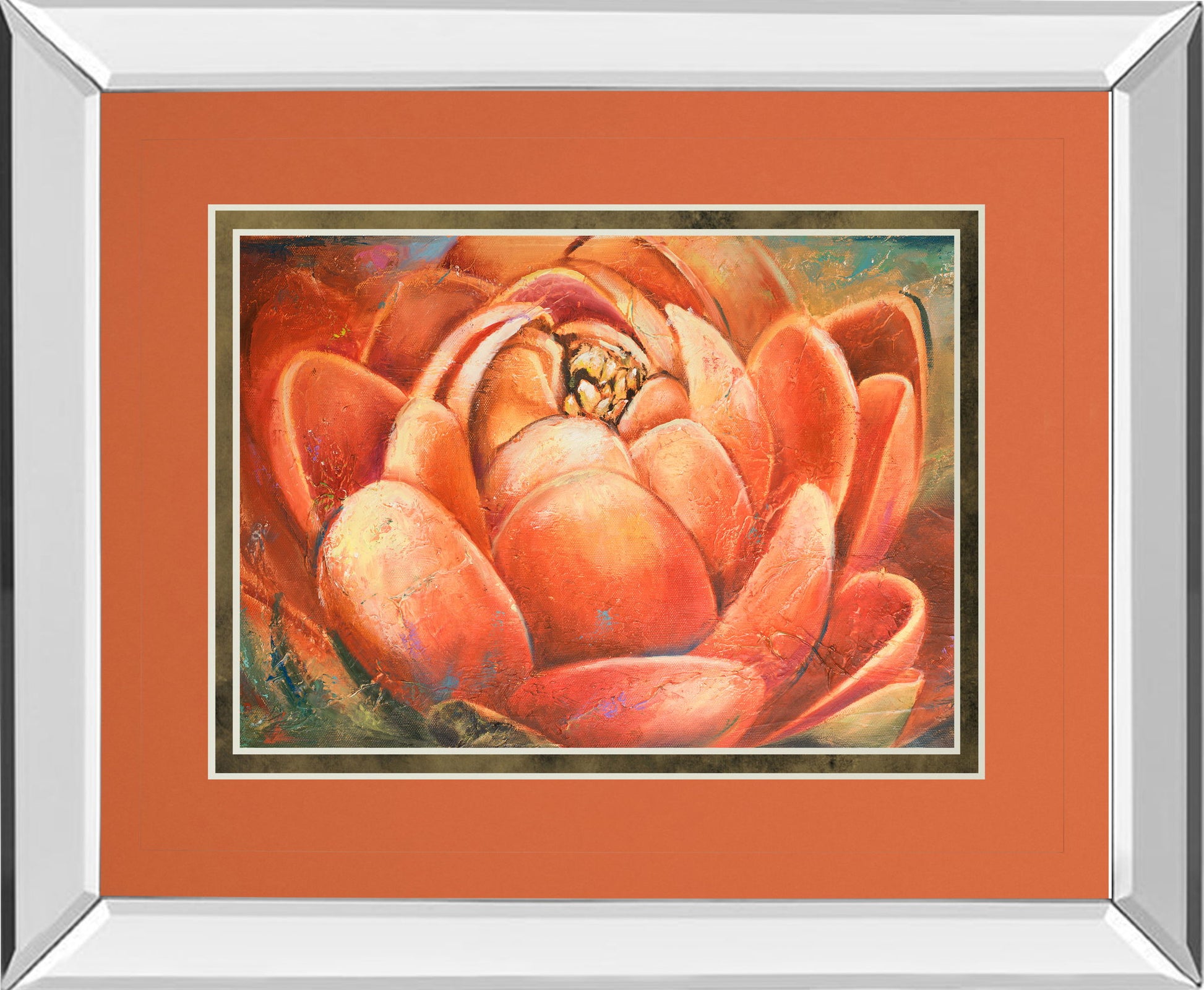 Immerse yourself in the vibrant allure of a blossoming lotus with this striking framed wall art. Rich orange and coral petals unfold gracefully, inviting warmth and natural elegance into any room. The sleek mirrored frame adds a reflective depth that enhances the vivid botanical hues, while the double matting in earthy tones creates a polished gallery-style presentation. Crafted with premium materials and protected by real glass, this piece is designed to elevate living rooms, bedrooms, or offices with its sophisticated charm and timeless transitional style. Ready to hang with durable hardware, it effortlessly transforms your space into a serene and inspiring retreat.