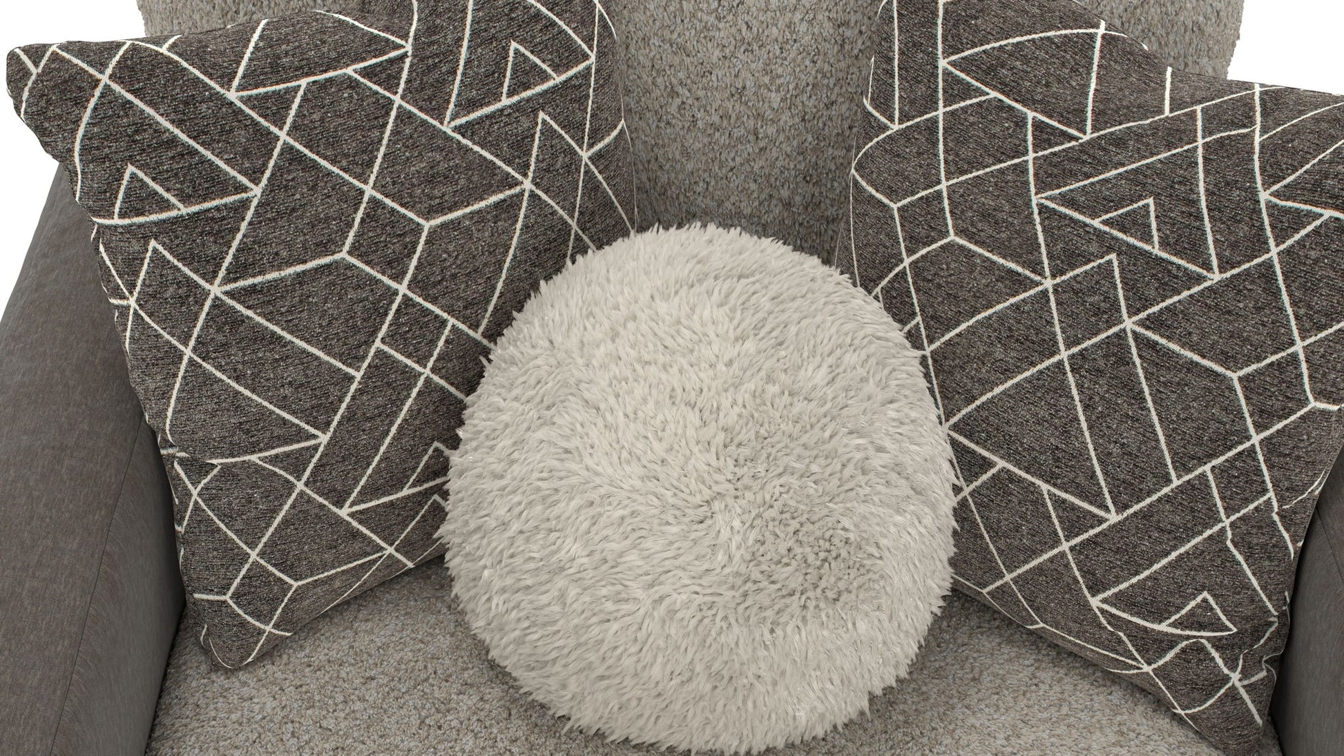 Reddington is a stationary sofa group that the ultimate comfort of our Cuddler Cushion. This dual-fabric application is accented with an ecelectic mix of toss pillows in a variety of textures - including sphere pillows in a luxurious faux fur. Reddington includes a convenient Cocktail Ottoman and is available in one color combination: Slate/Fawn.