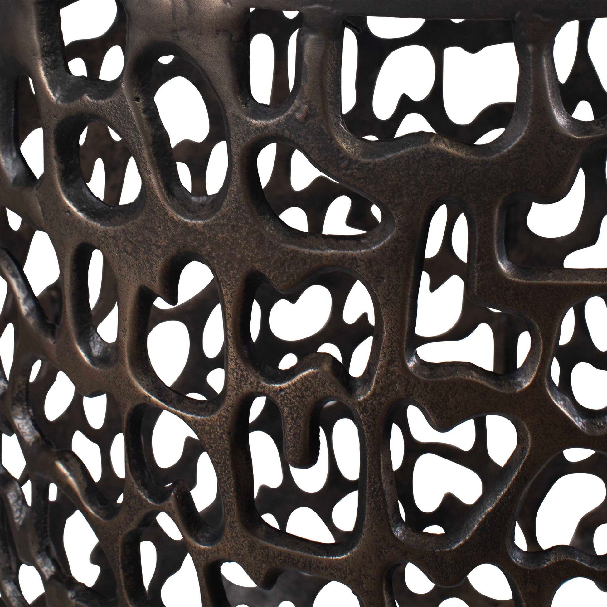 This Striking Table Boasts A White Marble Top With Subtle Veining, Creating A Luxurious Contrast With The Warm, Dark Finish Of Its Intricately Patterned Cast Aluminum Base. Due To The Nature Of Natural Stone, Every Piece Will Vary Slightly Ensuring Yours Is Unique. Suitable For Both Indoor And Outdoor Use.