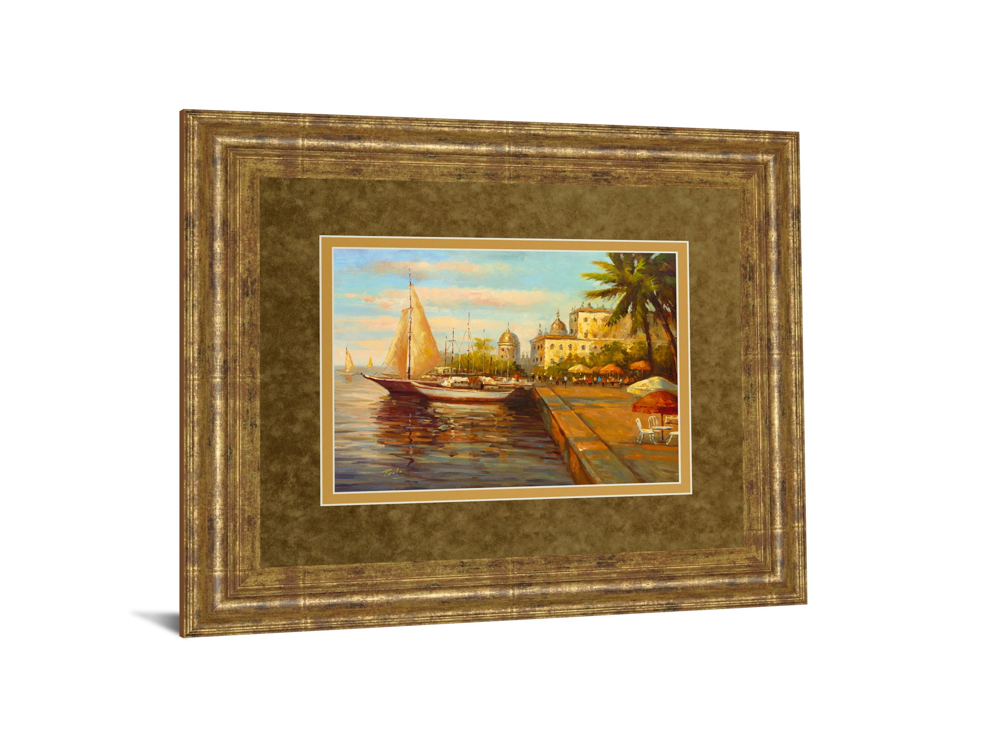 Step into a tranquil coastal scene with Harbor Serenity, a beautifully framed wall art that captures the gentle rhythm of sailboats resting by a sunlit harbor. The artwork invites you to wander along the waterfront promenade, where historic buildings and swaying palm trees bask in warm golden light. Enhanced by a rich gilded frame and layered brown and beige mats, this piece offers a sophisticated depth that transforms any living space into a peaceful seaside retreat. Crafted with premium real glass, it preserves vibrant colors and fine details, creating a gallery-quality finish that evokes the calm and charm of a coastal escape.