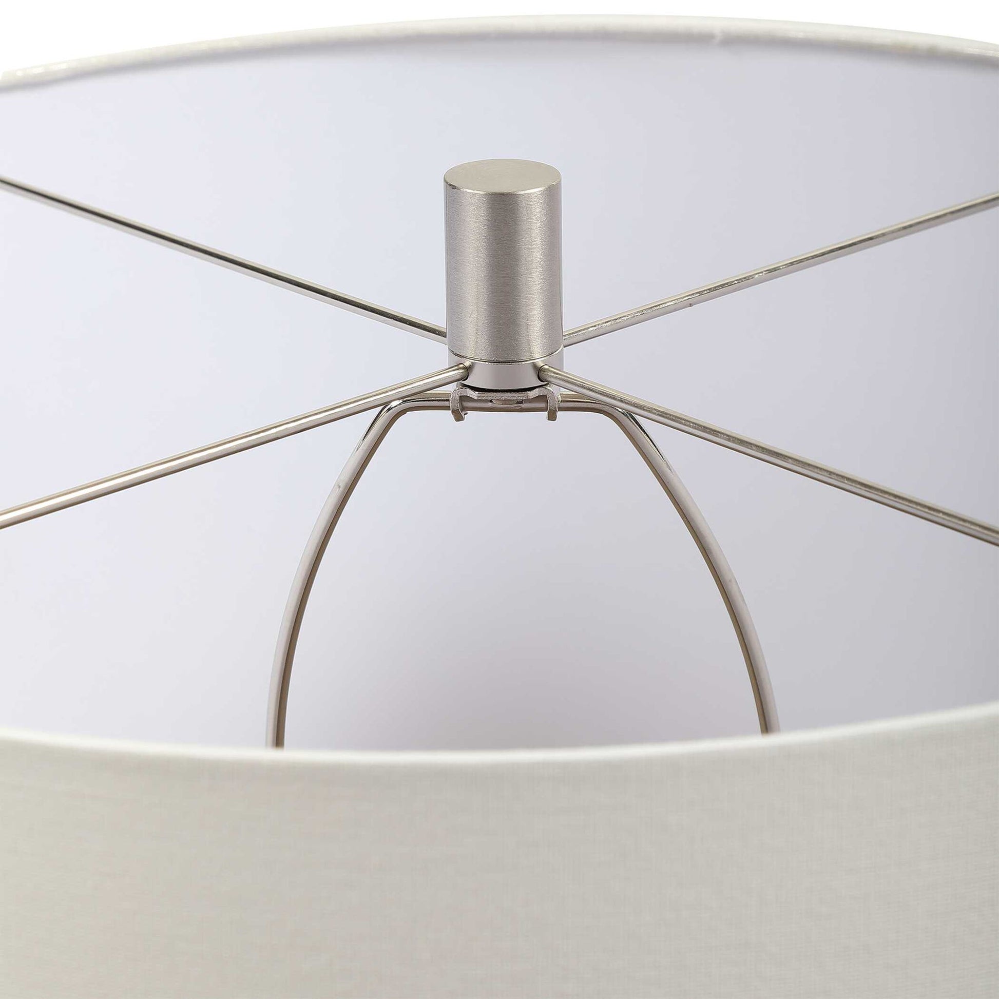 Finished In A Stunning Deep Teal Glaze, This Ceramic Table Lamp Features Hand Carved Organic Vertical Lines Accented With Brushed Nickel Details. The Lamp Is Paired With A White Fabric Drum Shade.