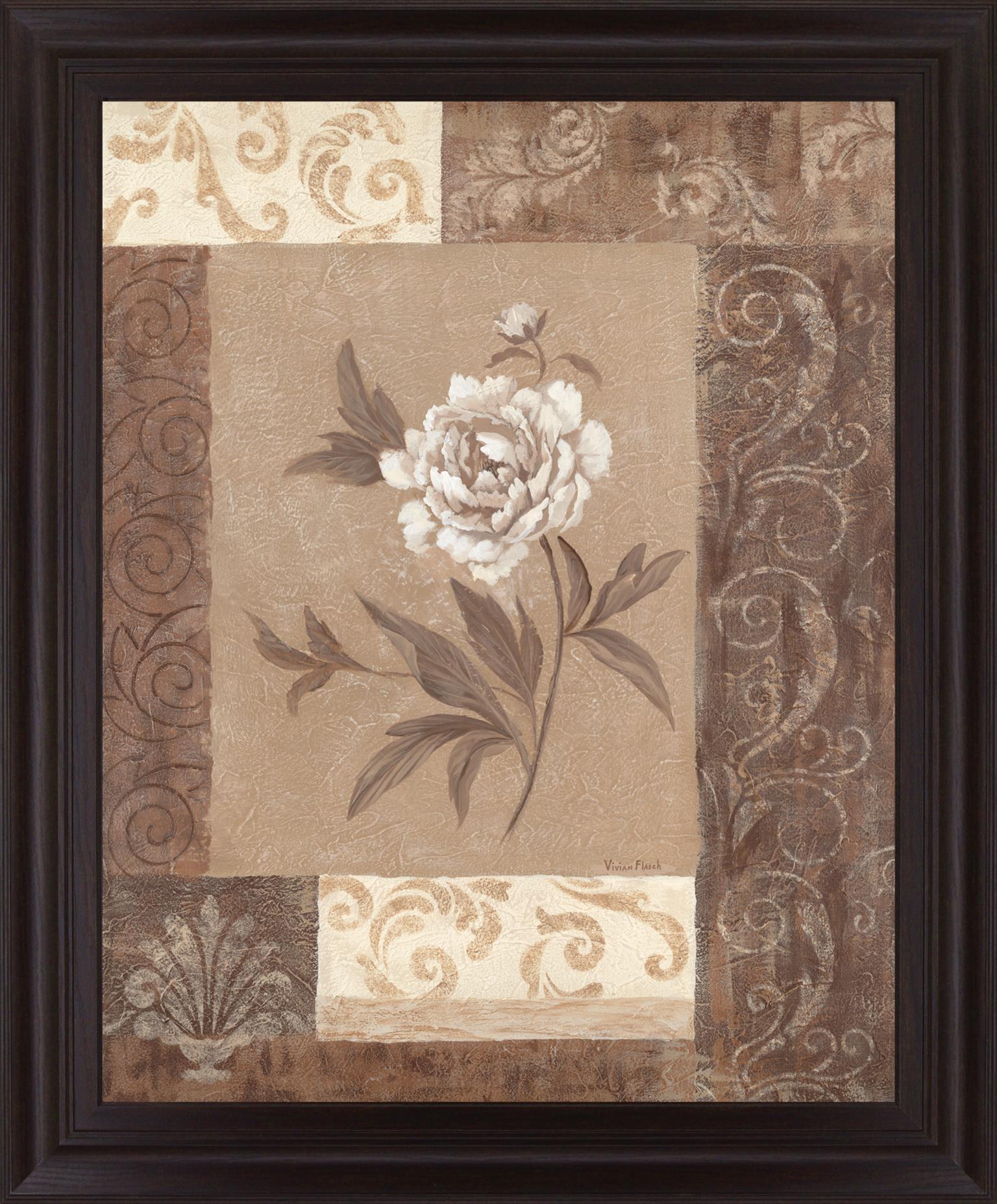 Invite a serene touch of nature into your space with this elegant peony wall art. Rendered in soft beige, brown, and cream hues, the delicate flower blooms gracefully against a textured background framed by intricate scrollwork patterns. The dark chocolate frame enhances the artwork’s warm tones while protecting it behind real glass, making it a sophisticated focal point for your living room, bedroom, or office. Expertly crafted and ready to hang, this piece blends classic botanical beauty with transitional style, creating a refined atmosphere that complements a variety of décor.