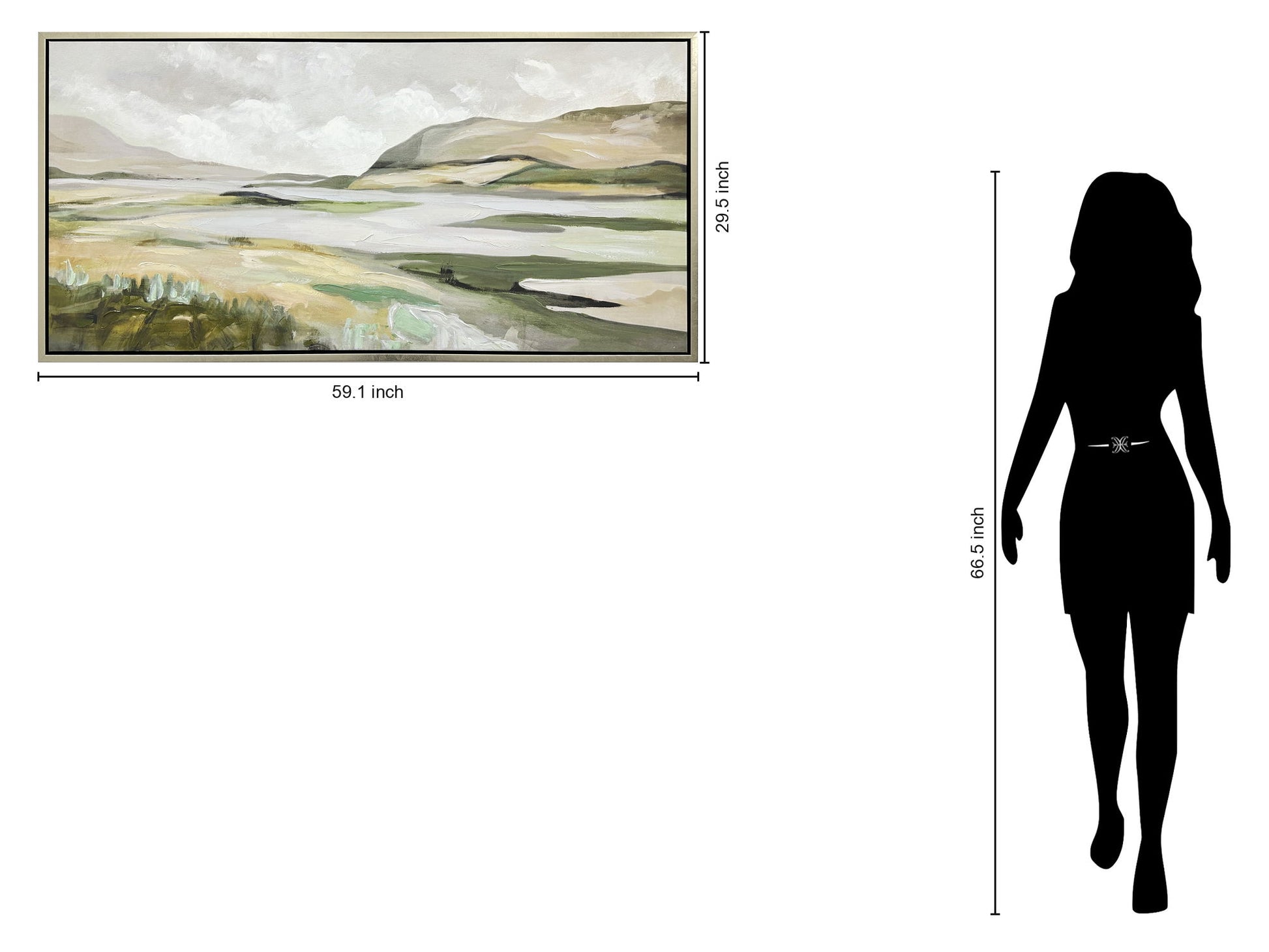 Immerse yourself in the tranquility of nature with this serene landscape oil painting. The gentle hues of green and beige evoke a sense of calm, making it a perfect addition to any living space. This hand-embellished piece, framed elegantly, brings the beauty of the outdoors into your home.