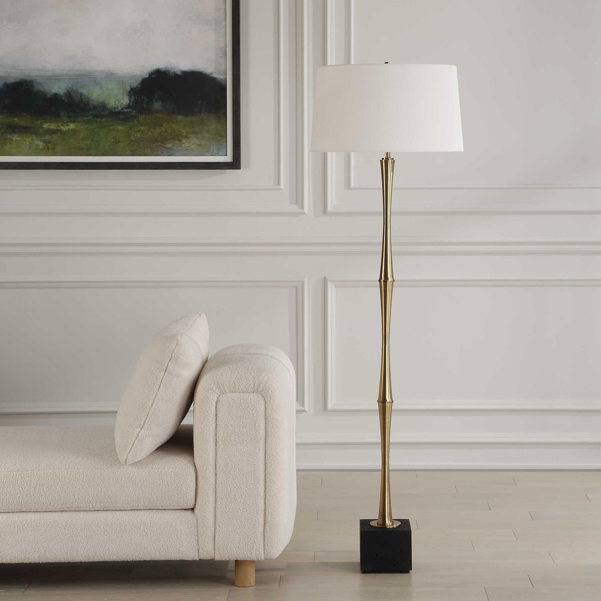 The Shino Floor Lamp Seamlessly Blends Both Contemporary And Traditional Decors. Crafted In Iron And Finished In Plated Antique Brass, The Timeless Design Is Displayed On A Thick Black Travertine Foot. The Slightly Tapered Round Hardback Shade Is A White Linen Fabric With Light Slubbing.