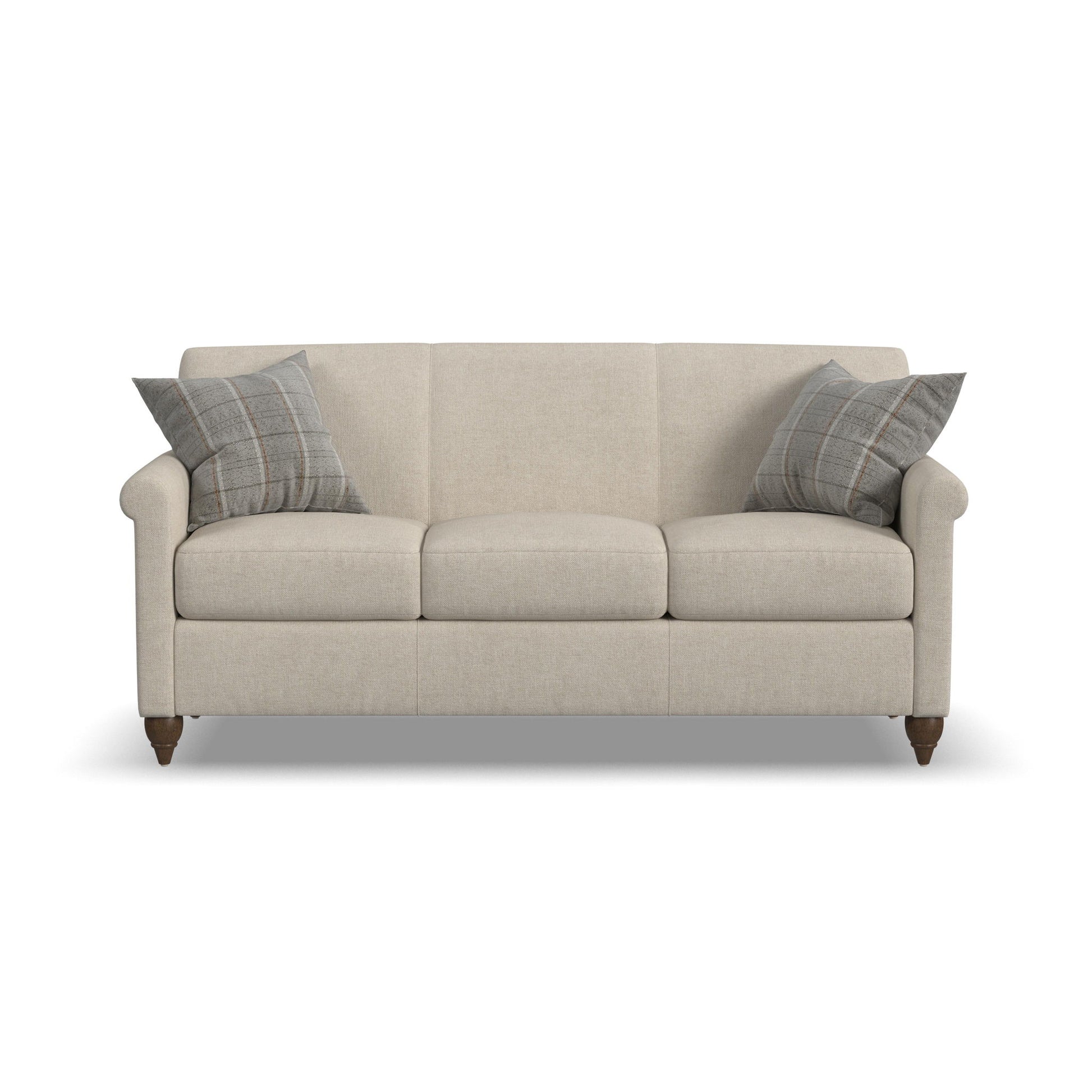 The perfect elegant piece to accentuate your home, the picturesque petite roll arms of the Stella sofa invite you in. Take a seat atop removable and reversible cushions that are supported by our patented Blue Steel Spring system – backed by our lifetime guarantee. Handcrafted with a durable frame and upholstered with careful detail, Stella is designed to last. The tight back and turned wood legs give this quaint sofa a modern flair. And with two accent pillows in your choice of fabric, elevate your home with the chic style of Stella.